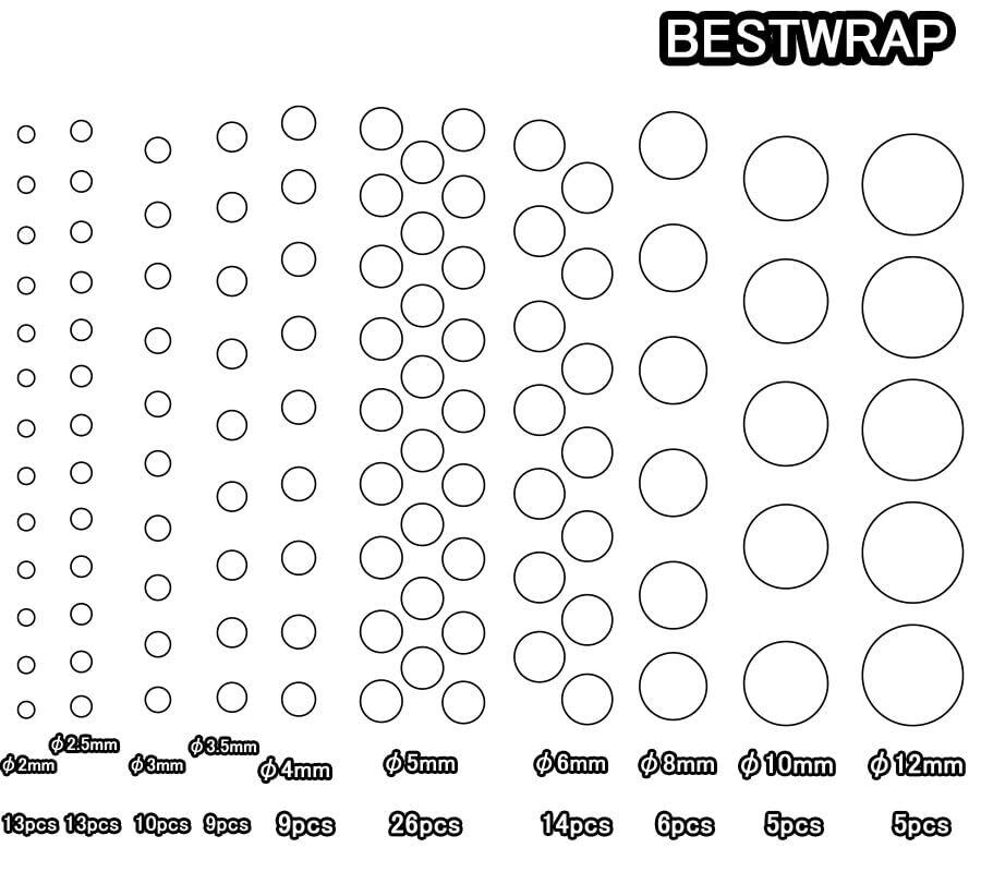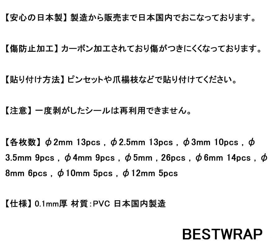【安心の日本製】 製造から販売まで日本国内でおこなっております。 【傷防止加工】 表面はエンボスやカーボン模様が施されており傷がつきにくくなっております。 【貼り付け方法】 ピンセットや爪楊枝などで貼り付けてください。 【注意】 一度剥がしたシールは再利用できません。 【各枚数】 φ2mm 13pcs , φ2.5mm 13pcs , φ3mm 10pcs , φ3.5mm 9pcs , φ4mm 9pcs , φ5mm , 26pcs , φ6mm 14pcs , φ8mm 6pcs , φ10mm 5pcs , φ12mm 5pcs 【仕様】 0.1mm厚 材質:PVC 日本国内製造 合同会社BESTWRAP
