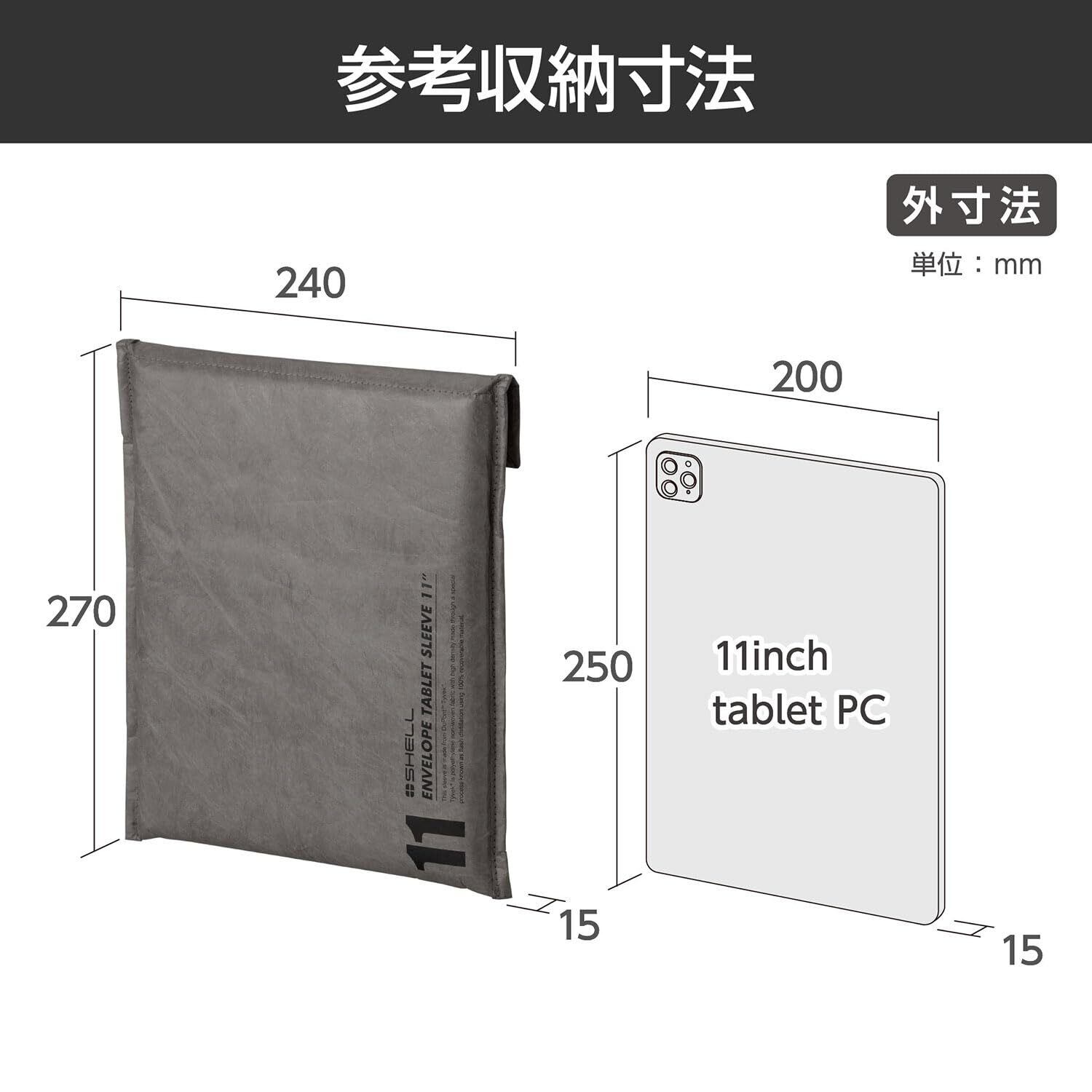 参考収容寸法 : 約W200×H250×D15mm、外寸法 : 約W240×H270×D15mm、重量 : 約50g、材質 : タイベック(R)、ポリエステル