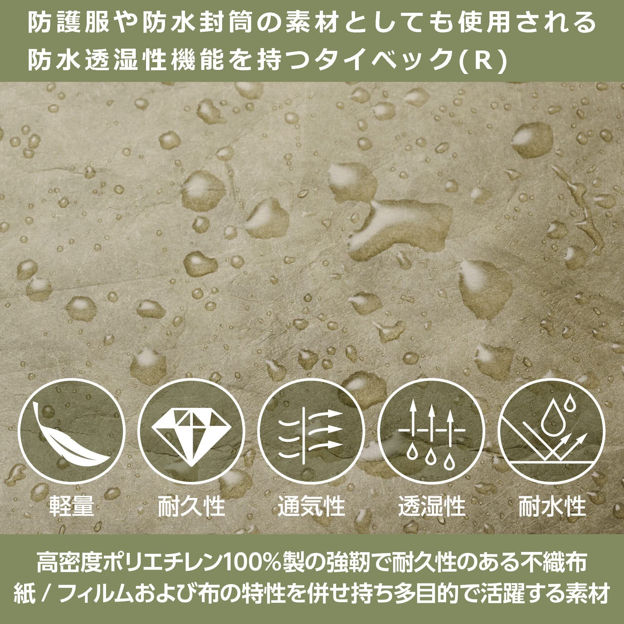 タイベック(R)は高密度ポリエチレン100%製の強靭で耐久性のある不織布で、超軽量なのに耐久性に優れ、水にも強い素材です。