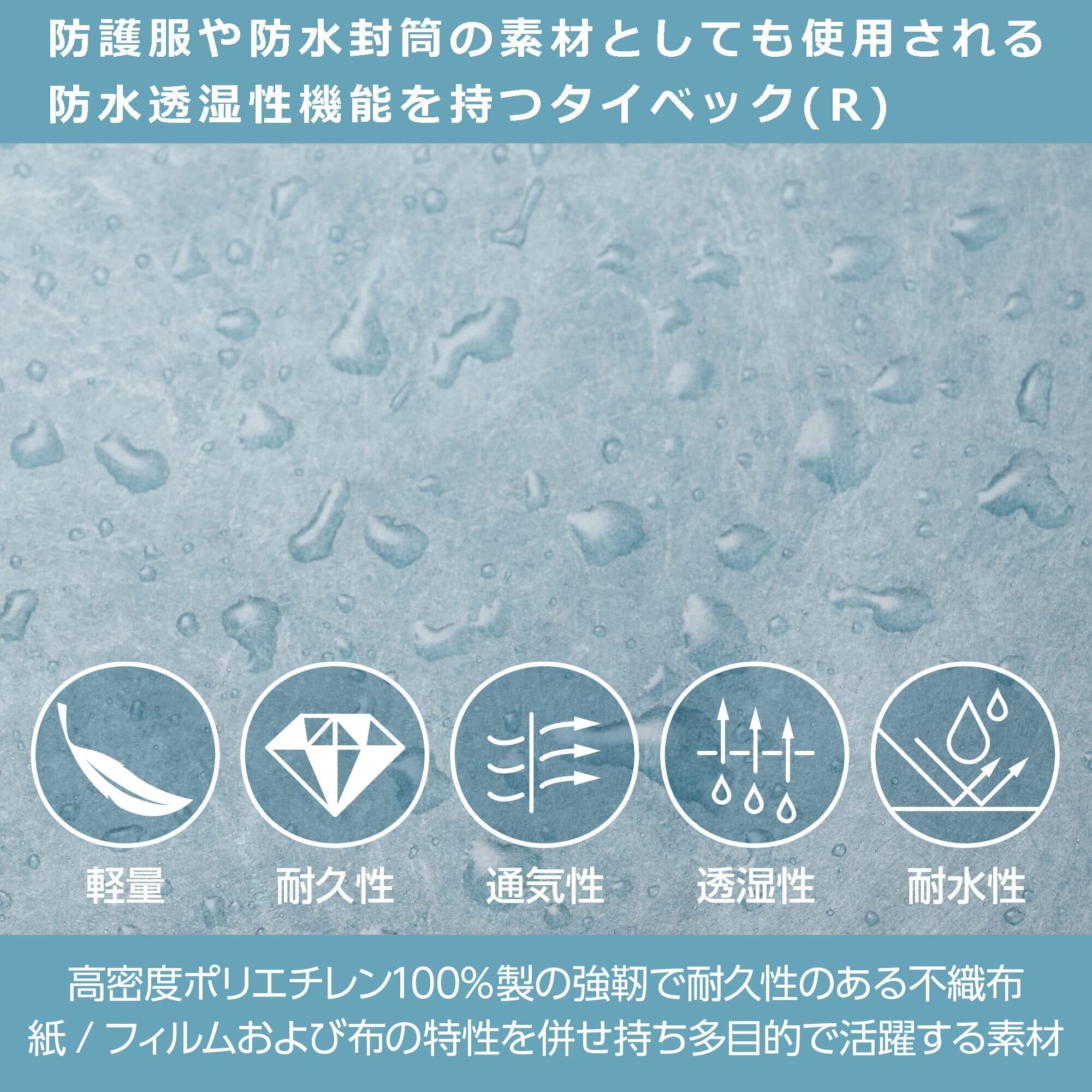 タイベック(R)は高密度ポリエチレン100%製の強靭で耐久性のある不織布で、超軽量なのに耐久性に優れ、水にも強い素材です。
