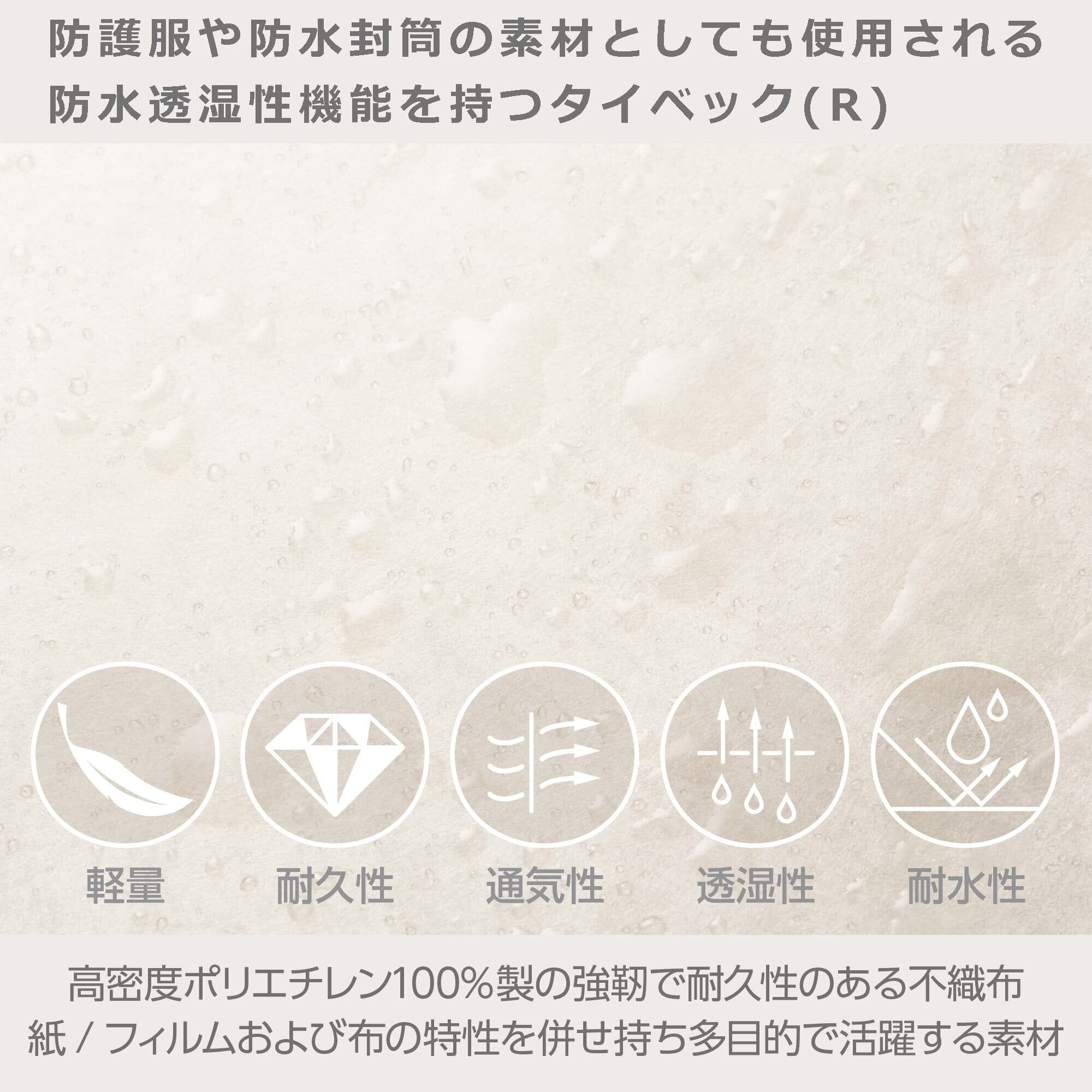 タイベック(R)は高密度ポリエチレン100%製の強靭で耐久性のある不織布で、超軽量なのに耐久性に優れ、水にも強い素材です。