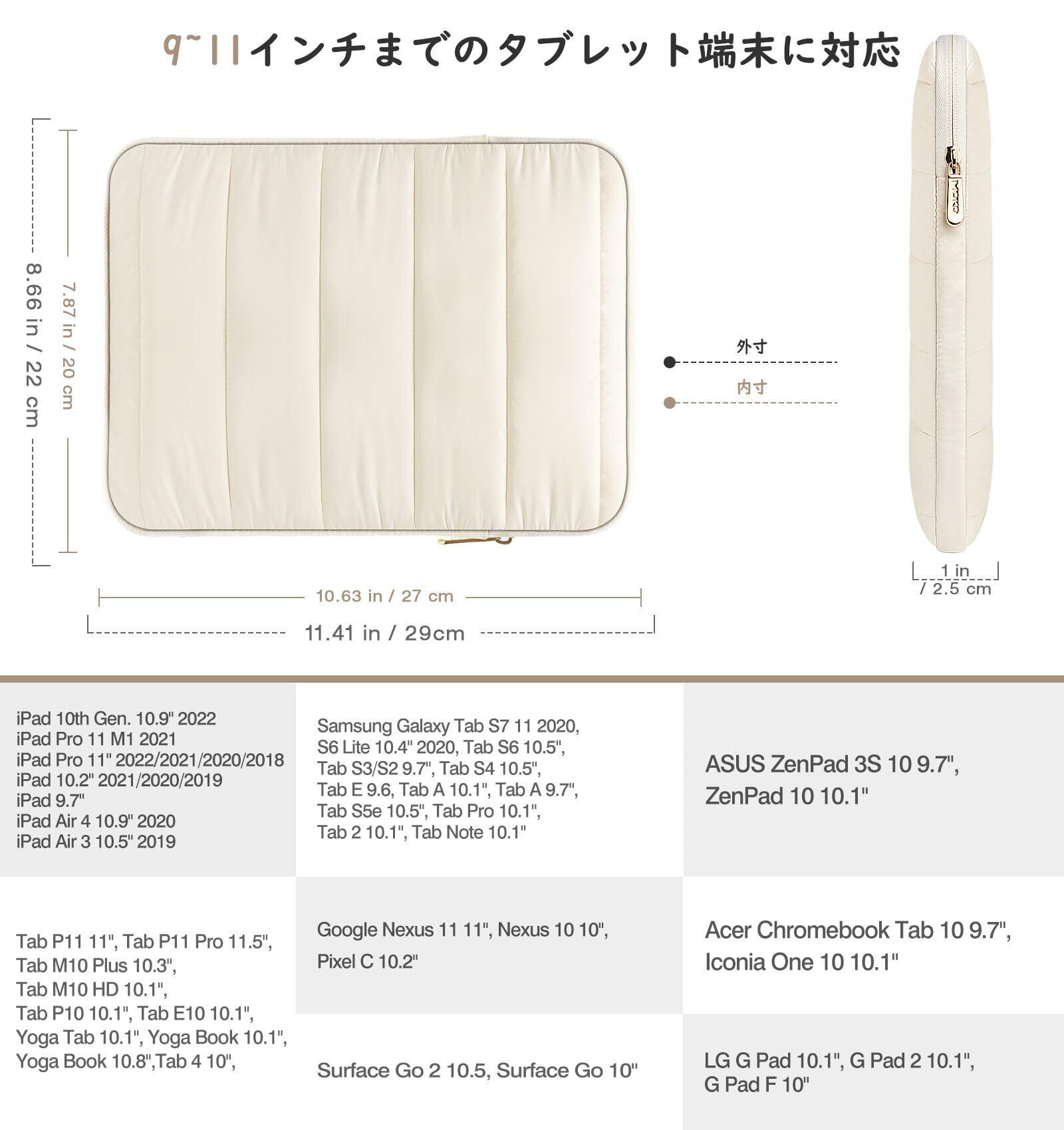 「9~11インチまでのデバイスに対応」当商品は外寸29*22*2.5cmで内寸27*20cmとなる主にタブレットを収納用保護インナーバッグです。iPad Pro M4 2024/iPad Air M2 2024/iPad Air 5/4 10.9/Air 3 10.5/iPad 10/ iPad 9/8/7 10.2/Galaxy Tab S8/S9/S9 FE/Tab A9+/Surface Go 2/3 10.5/Fire HD 10/10Plus/Fire max 11 2023などの9~11インチまでのノート・タブレットPCに適用しております。ご購入になる前に、お使いのデバイス機種モデルと寸法をしっかりと確認してください。