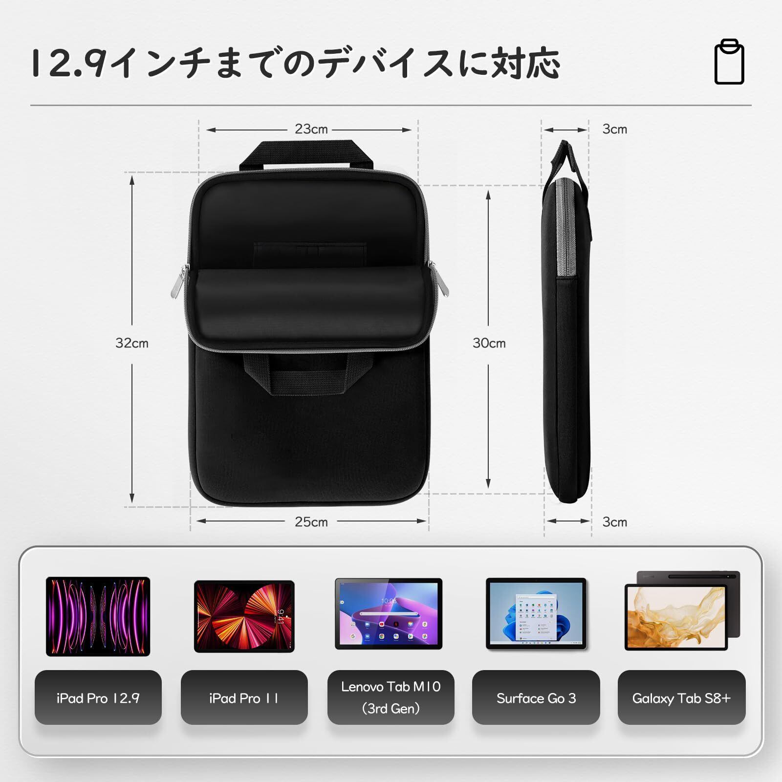 「12.9インチまでのデバイスに対応」当商品は外寸32*25*3cmで内寸30*23cmとなる主にタブレットを収納用保護インナーバッグです。iPad Air/Pro 13インチ(M3/M2)、iPad Pro 11インチ 2018-2022、iPad Pro 12.9インチ 2018-2022、Surface Laptop Go 12.4"、Surface Pro、Xiaomi POCO Pad/Redmi Pad Pro、Xiaomi Pad 6S Pro 12.4インチ、Lenovo Tab P12、Lenovo Chromebook 10.1インチ/11.6インチ/12.2インチ、ASUS Chromebook 10.1インチ/10.5インチ、DellLatitude 5285 12.3インチ、FreeandeasyCF SZ6 12.1インチ、panasonicCF-SZ6 12.1インチ/CF-XZ6 12"などの13インチまでのノート・タブレットPCに適用しております。ご購入になる前に、お使いのデバイス機種モデルと寸法をしっかりと確認してください。