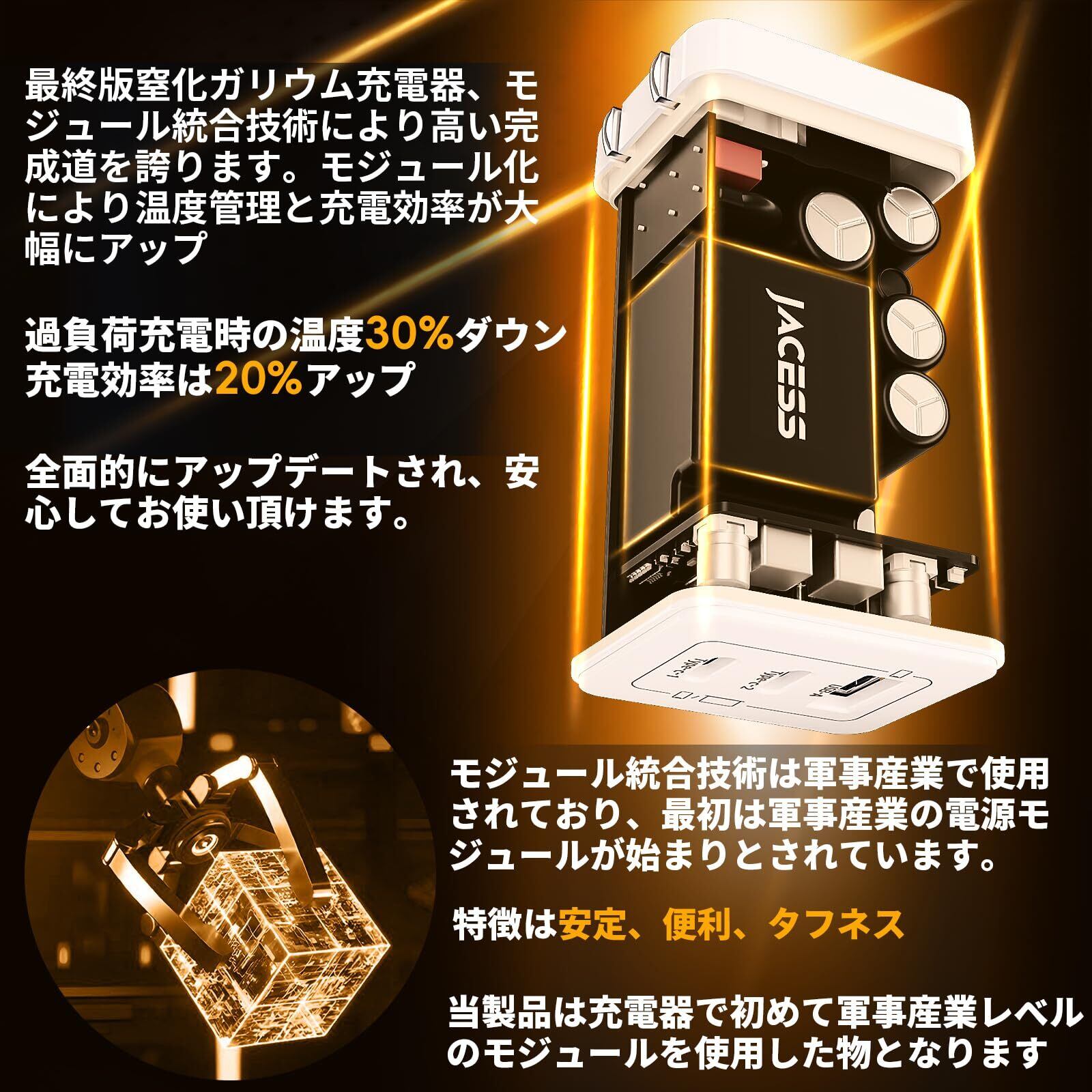 【広範な互換性と完璧なアフターサービス】USB-C充電器は、Windows PC/MacBookノートパソコン/iPad Pro/iPad mini/iPhone/Androidスマートフォン/タブレット端末/iWatch/ゲーム機/Airpods/扇風機などに対応しています。AC 100-240Vの世界中の電圧にも対応しております。海外旅行や出張にも大活躍です。何か問題があればいつでもお問い合わせいただければ、6時間以内に問題を解決いたします。Jacessは、充電器の研究開発と製造に重点を置き、最新の技術を採用し、満足のいく価格と安心のサービスで、世界100か国で品質の充電器を提供しています。お客様の声を大切にし、サービスを継続的に改善していきます。技術的な充電ケーブルを使用する場合は、対応するケーブルと高速充電に対応したデバイスを選択してください。注意:高功率小型設計のため、充電中に本体が温かくなる場合がありますが、安全規格に基づいて設計されております。