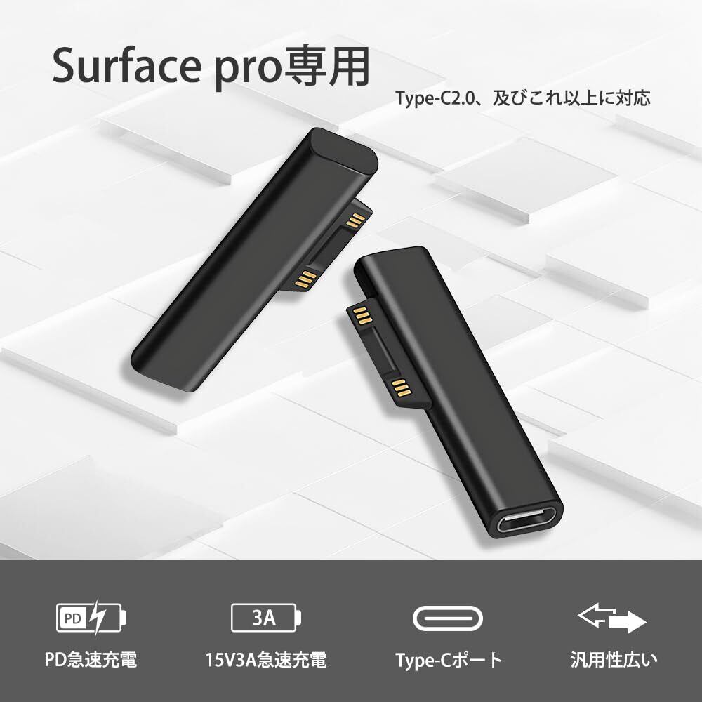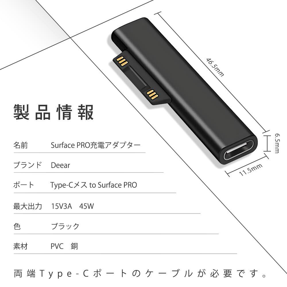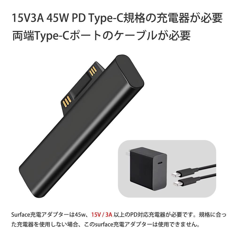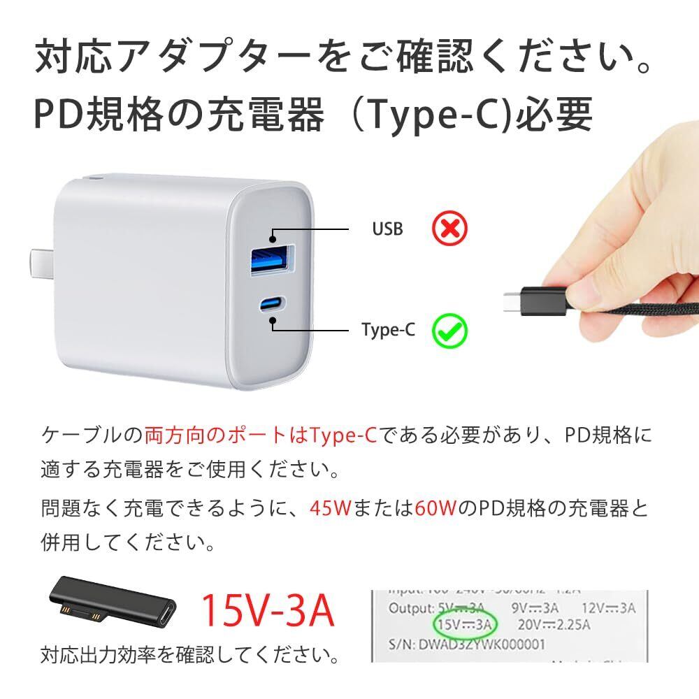 【ご注意】1.Surface充電アダプターは45w、15v以上のPD対応充電器が必要です。規格に合った充電器を使用しない場合、このsurface充電アダプターは使用できません。2.Type-Cケーブルは両端ともType-Cポートのが必要です。