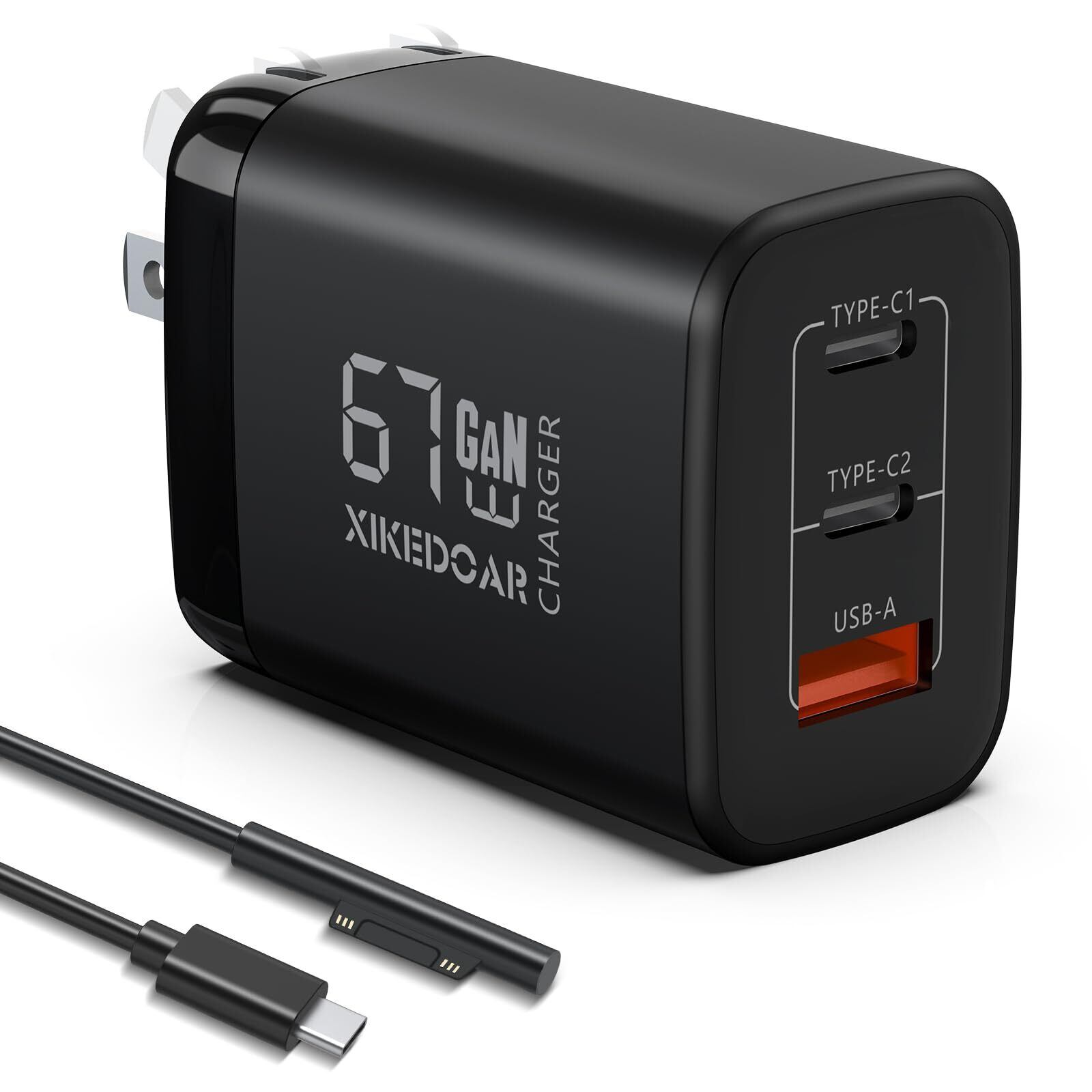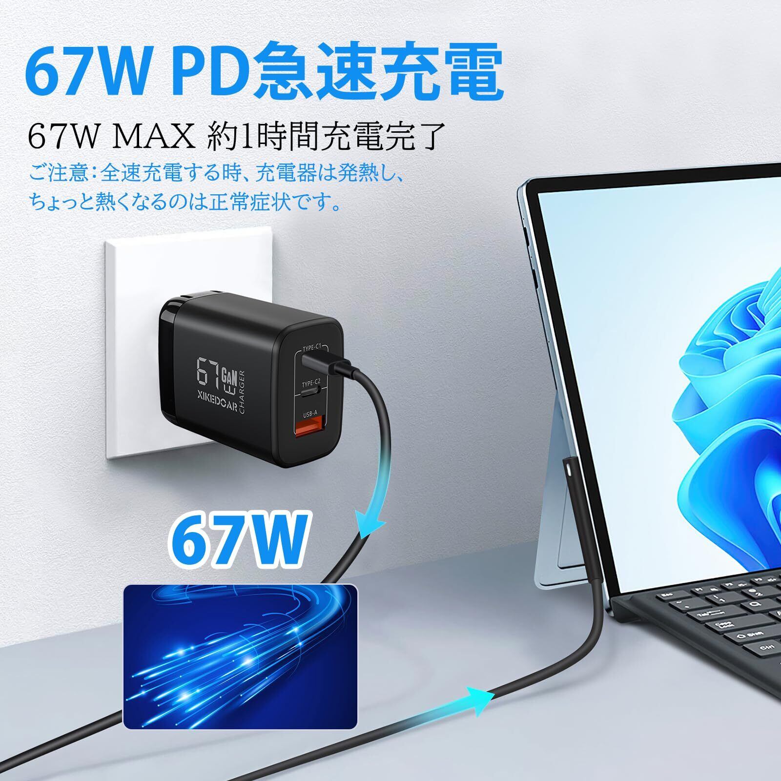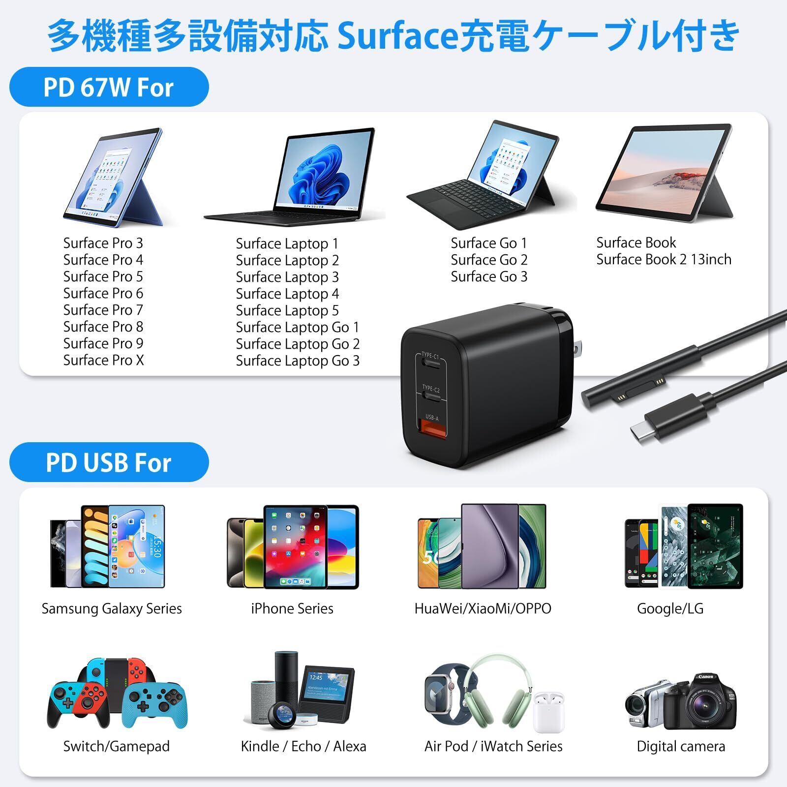 Surface 充電器 67W/65W/45W PD急速充電 サーフェス充電器 【PSE認証済】Surface Pro, Surface Book, Surface Go, Surface Laptop 互換 電源アダプター 充電ケーブル付き USB-C 2ポート USB-A 1ポート搭載 折畳式 ACアダプター