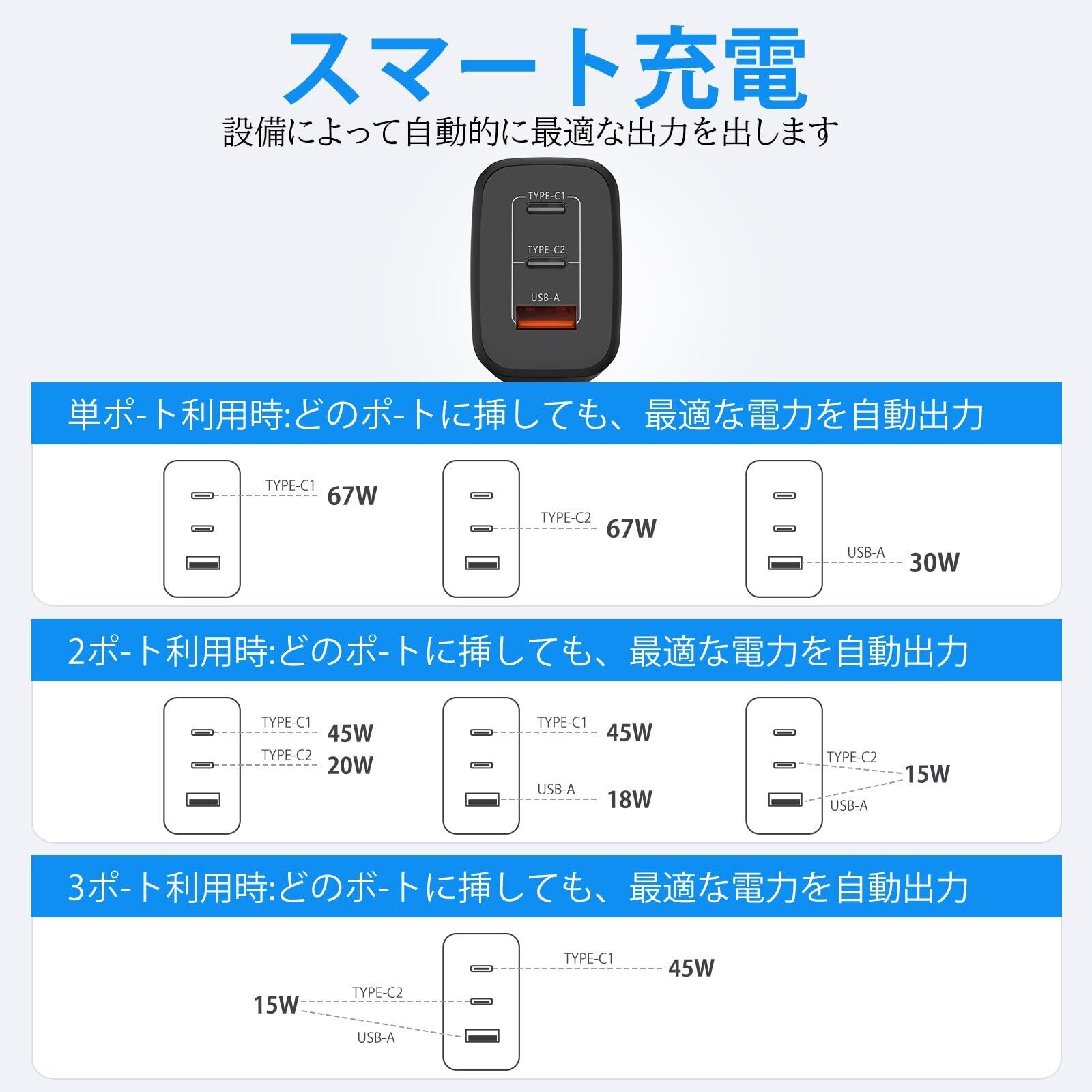 【革新型3in1充電器】BC1.2、DCP、QC2.0、QC3.0、QC4+、AFC、FCP、PD2.0、PD3.0、PPS、SCP様々な急速充電をサポートします。充電ポートは2つのUSB-Cポート(MAX 67W)と1つのUSB-Aポート(MAX 30W)が含まれています。2種3つUSBポート、1台の充電器だけでパソコン、スマホ、タブレット、イヤホンなど様々な電子設備に充電可能です。100〜240ボルトの広範囲の電圧、世界中に旅を立ちます。