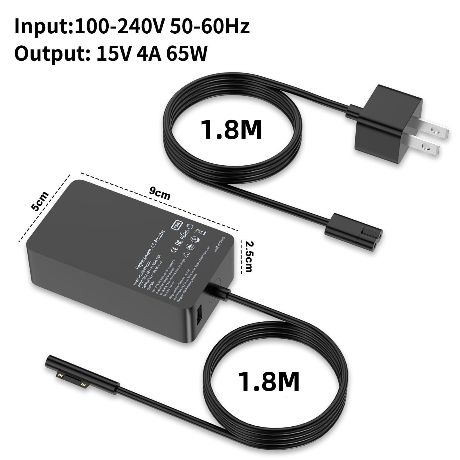 入力は AC 100-240V 1.5A 50-60Hz、出力は 15V 4A 65W。USB ポートは 5V-1A 5W。互換性のある Microsoft 24W 36W 44W にも適用可能で充電効率が高い。