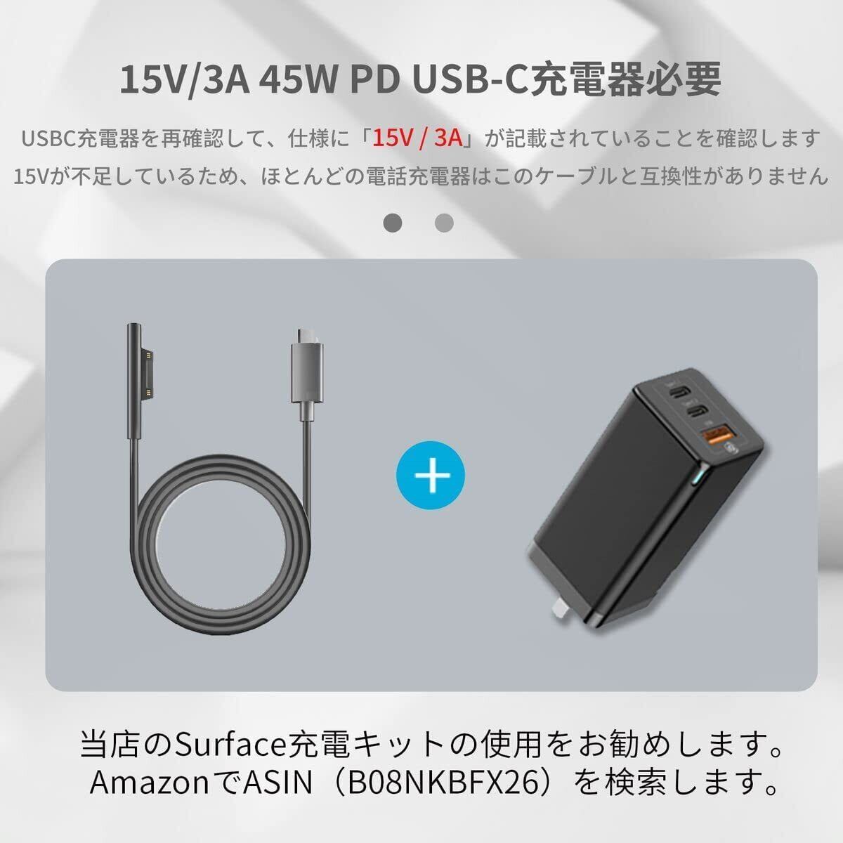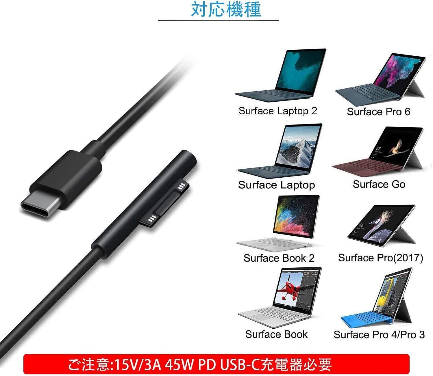 【ご注意】本ケーブルは45w、15v以上のPD対応充電器が必要です。両端がUSB-Cのケーブルを使用し、PD機能を用いたアダプターまたは充電器を必ず使用してください。一部のApple PD充電器は45w、15v出力がないためケーブルには使用できません。規格に合った充電器を使用しない場合、このsurface充電ケーブルは使用できません。