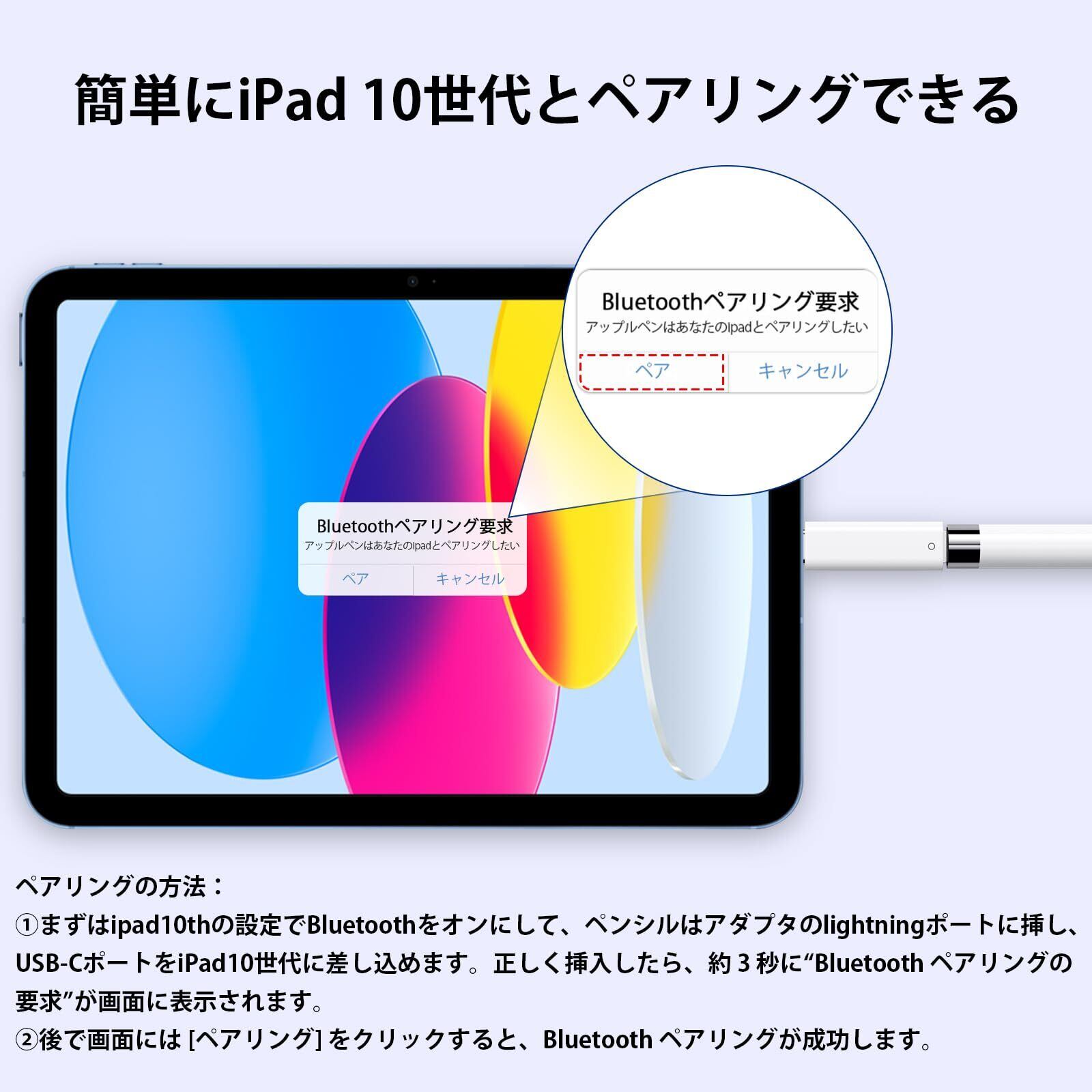 思った以上の便利さ:USB ケーブルが必要なくて対応iPad10世代を挿すだけでBluetoothペアリング可能です! 使用方法:①対応Apple Pencil充電方法:アダプタのTypeCポートを直接Pad10世代に差し込んで、後はアップルペンシル第1世代をアダプタのライトニングポートに差し込みます。次に、アイパッドでペンシルの充電状態を確認します。②対応iPad第10世代とペアリング方法:まずはpad10thの設定でBluetoothをオンにして、アダプタのUSBCポートをPad10世代に差し込んで、正しく挿入したら、約 3~5 秒に“Bluetooth ペアリングの要求”がiPad画面に表示されます。後で [ペアリング] をクリックすると、Bluetooth 接続が成功します。