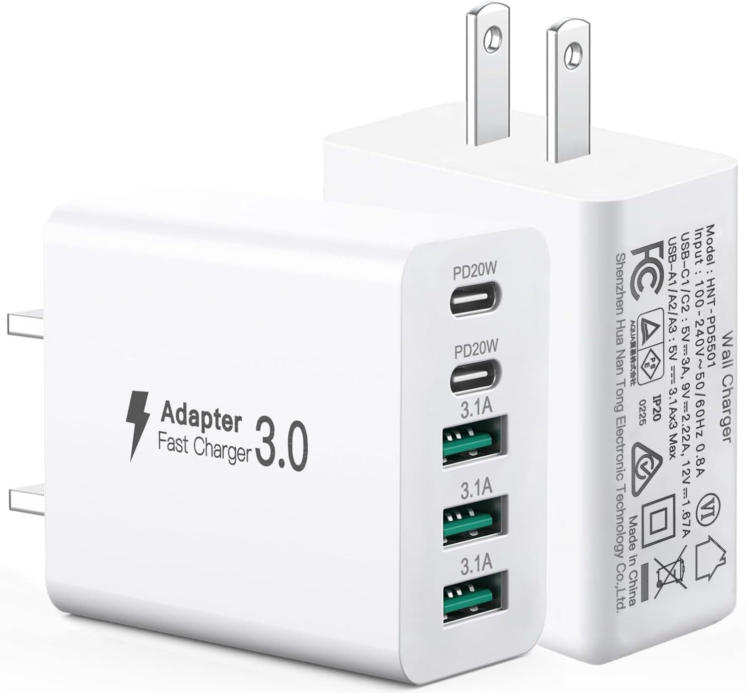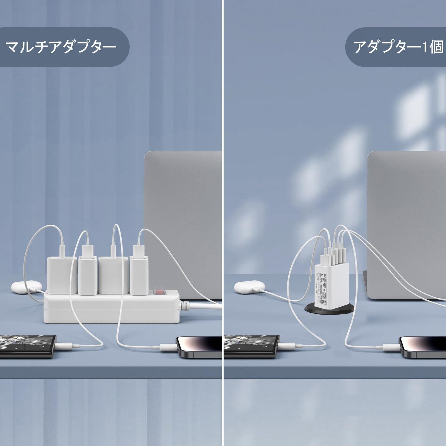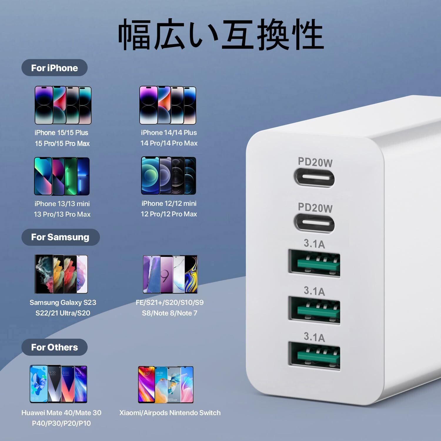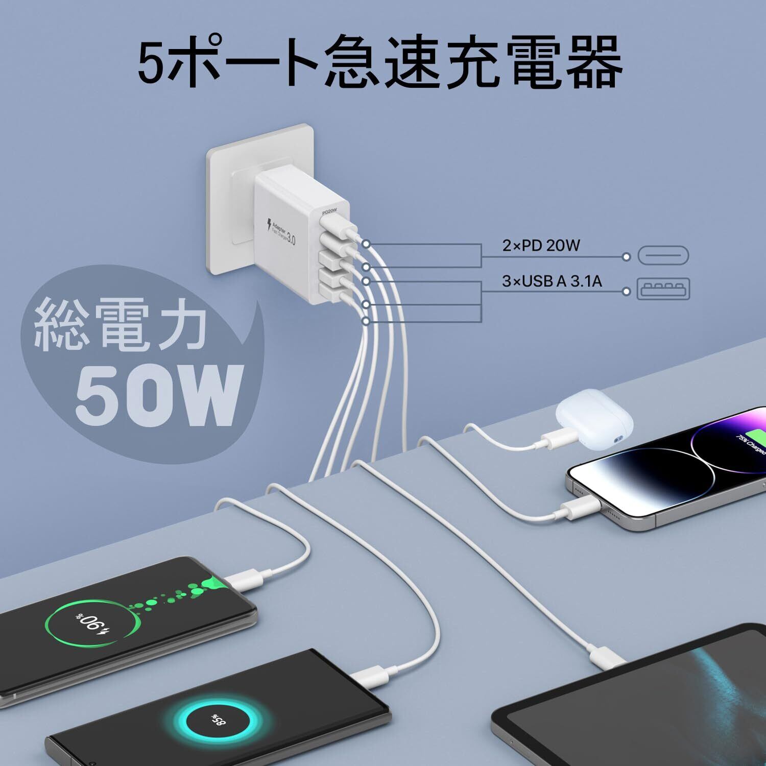 [2個パック] USB C充電器 50W、【2つのUSB-Cと3つのUSB-A】を備えた5ポートマルチType-Aプラグ、総電力50WUSB電源アダプタ壁コンセント、急速充電PD 3.0電源アダプタ iPhone 11/12/13/14/15/16/XS/XR/SE/8 Plus/サムスン/携帯電話/タブレット対応