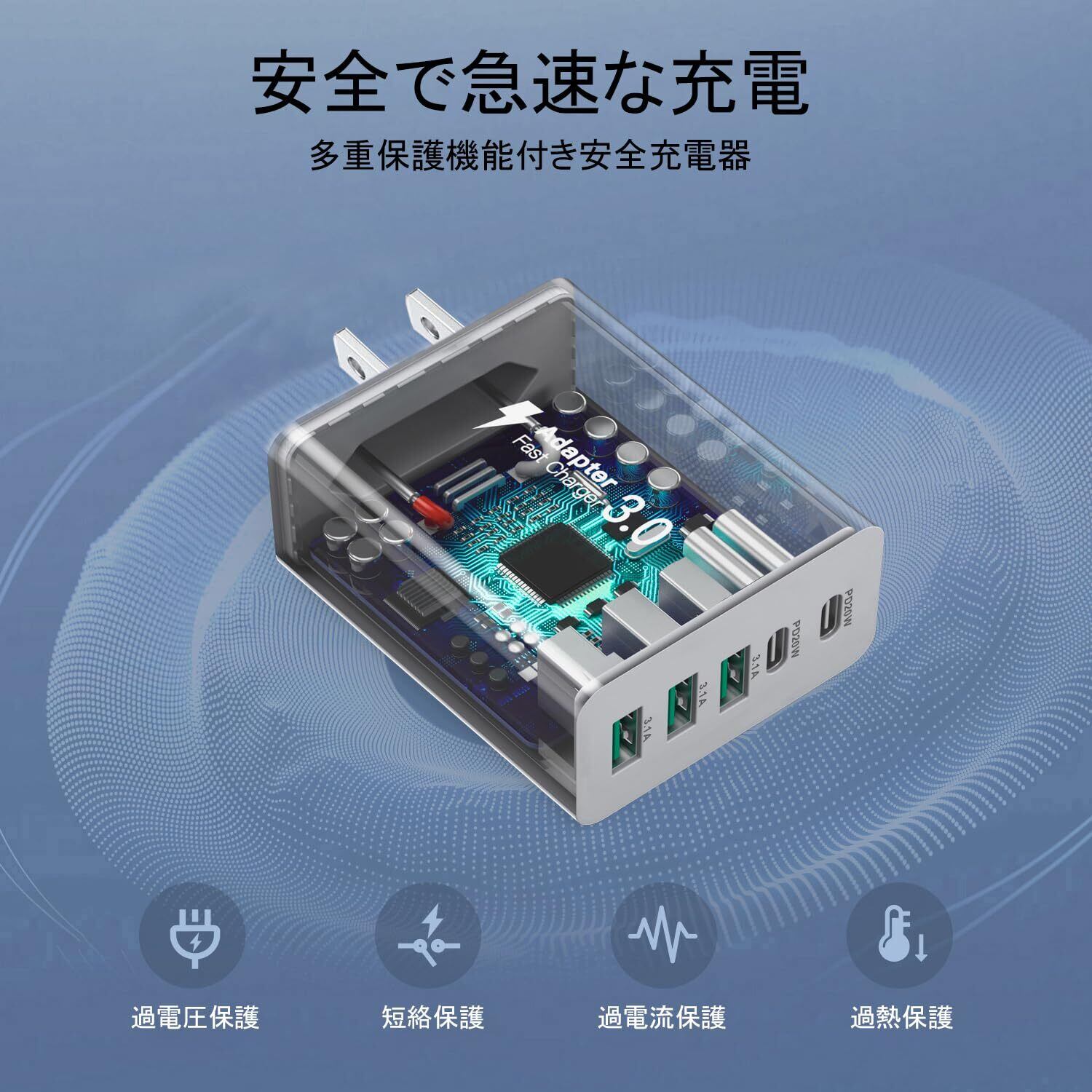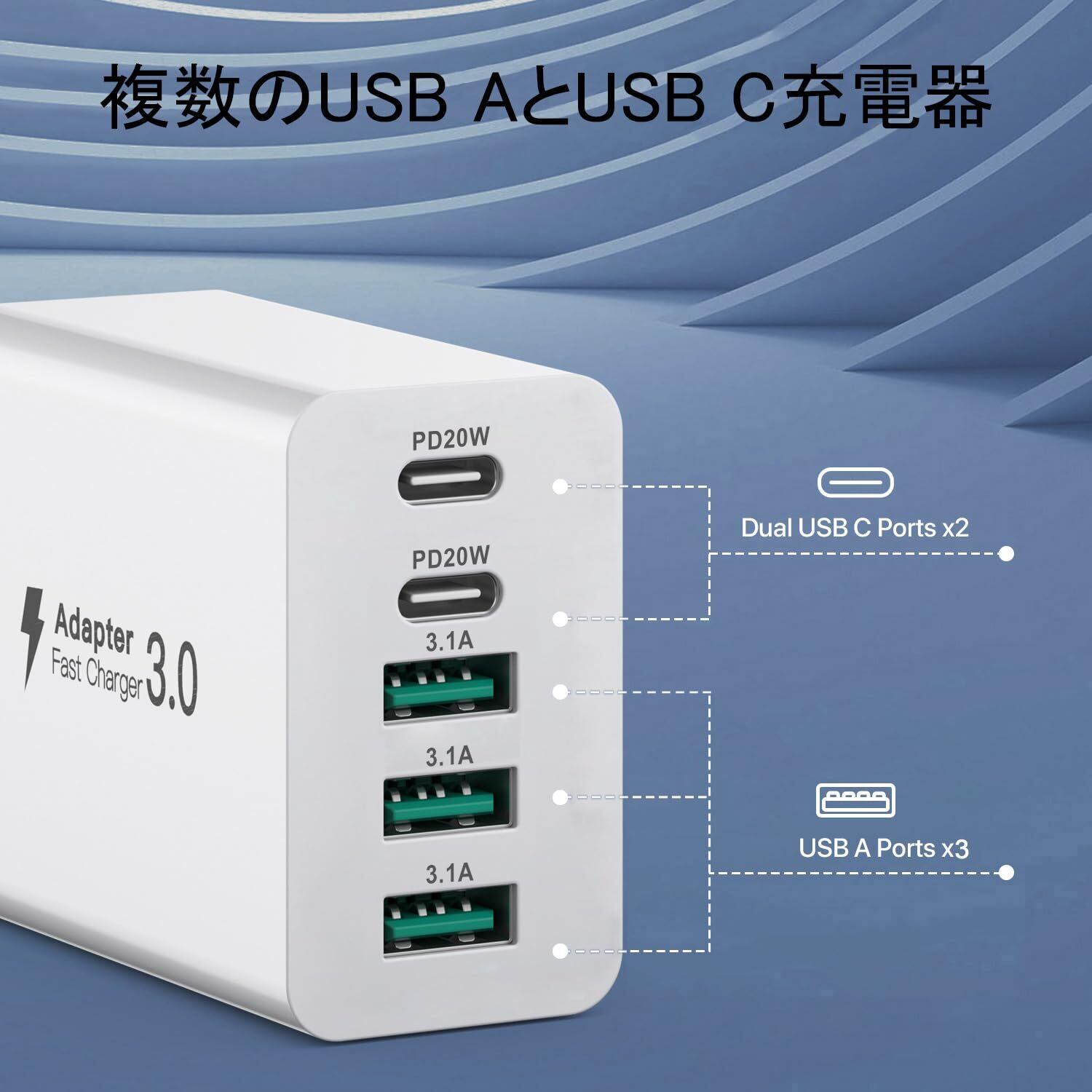 【総電力50W USB C充電器】5 in 1 USB充電器は、PD20W充電速度の2つのUSB-Cポートと3.1A/5V充電速度の3つのUSB-Aポートを備えています。充電器はPower DeliveryとQuick Charge 3.0に対応し、USB C充電器は30分で携帯電話を15%から60%まで充電できます。