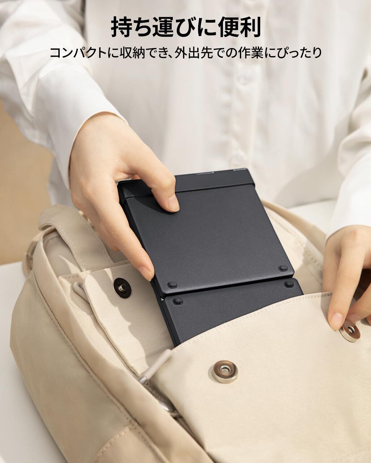 【持ち運びやすい折りたたみキーボード】欧米のSNSで話題沸騰中の2025年最新版XK01折り畳みキーボードが初登場!持ち運びやすさと使いやすさを兼ね備えモデルです。三つ折り構造で折りたたむとiPad miniと同じくらいサイズになり、重さも291gと軽量で、外出や出張などの際の持ち運びに便利です。使用しない時はカバンの隙間やパソコンケースにサッと収納できます。コンパクトで軽量な設計により、自宅だけでなく、カフェや図書館、オフィス、飛行機内など、場所を選ばず快適に作業ができます。(展開時サイズ: 38.58 × 11.89 × 1.22cm、折りたたみ時サイズ: 21.49 × 11.89 × 1.98cm)
