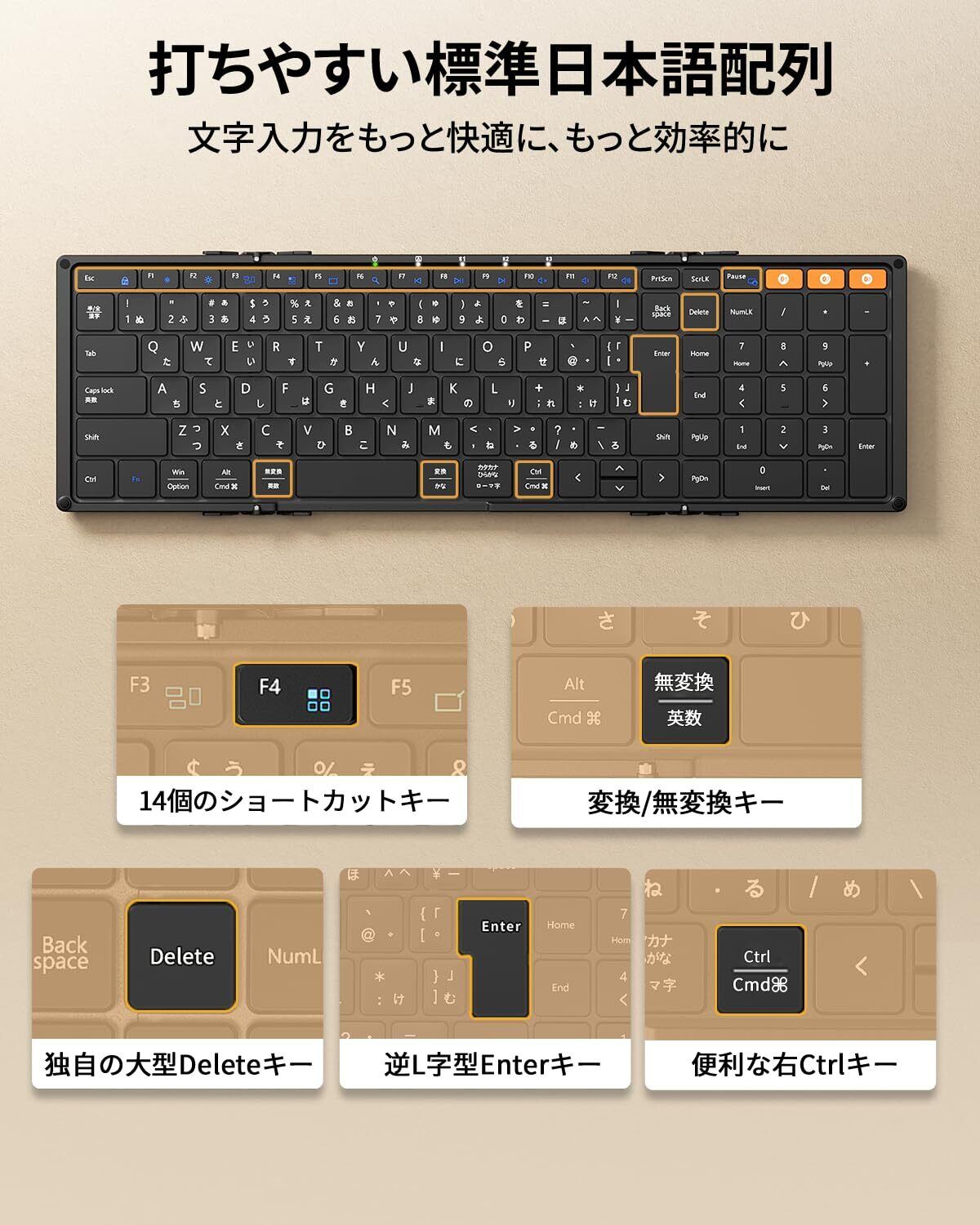 【打ちやすい標準日本語配列】JIS規格に準拠した標準日本語配列を採用しており、普段使いのキーボードから違和感なく移行できます。この折り畳みキーボードには、逆L字大型Enterキーや「半角/全角」キー、「変換」「無変換」キーなどの日本語入力に特化したキーだけでなく、右Ctrlキーや独立した大型Deleteキーなどの作業効率を高める特殊キーも配置されているため、スムーズな文字入力が可能です。