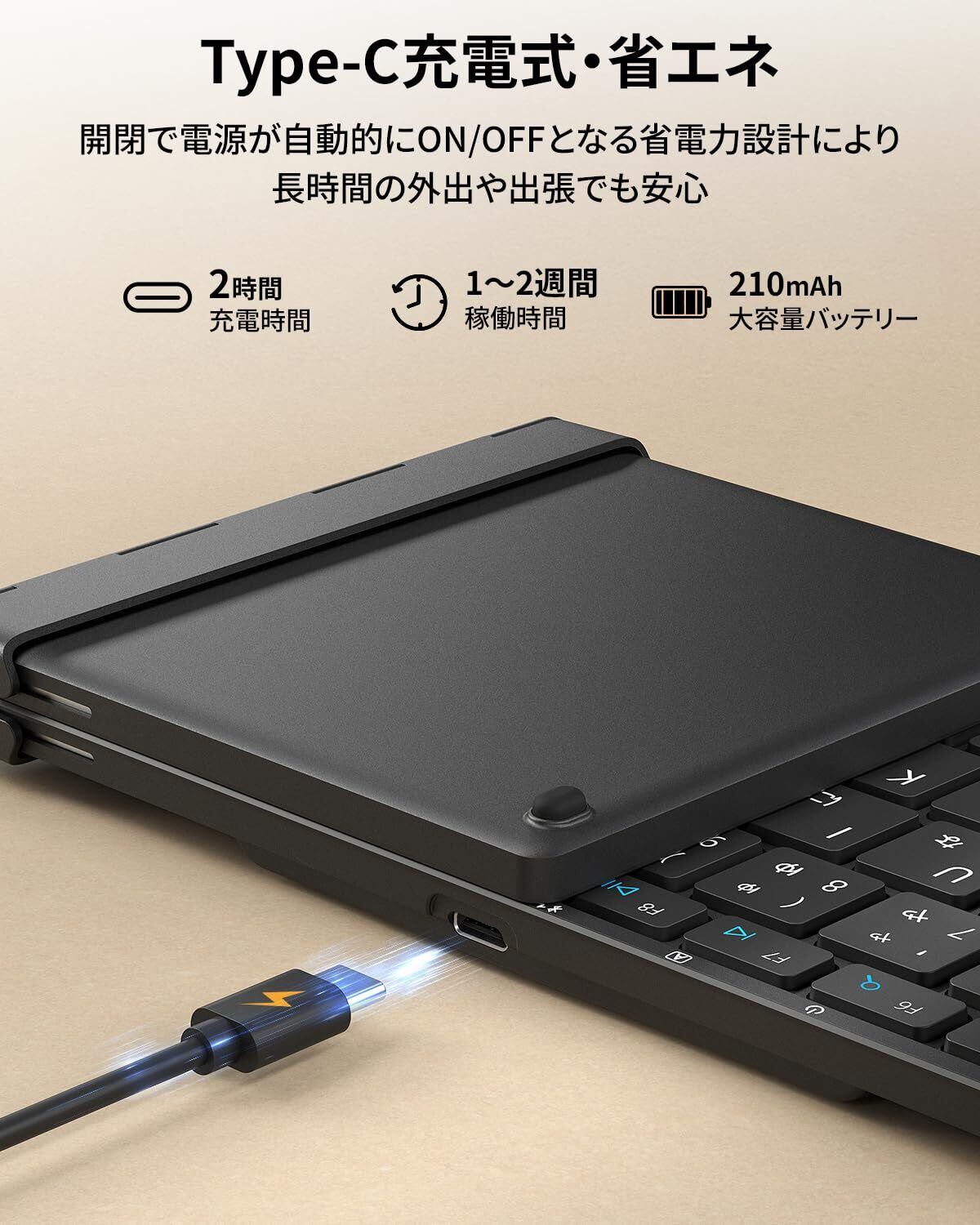 【Type-C急速充電&長時間使用可能】煩わしい電池交換が不要、経済的で環境にやさしいです。折りたたみキーボードは210mAhの大容量バッテリーを内蔵しており、1回のフル充電で約1〜2週間の連続使用や最大150日のスタンバイが可能です。また、60分無操作で自動スリープ、キーボード開閉で自動電源ON/OFF(折りたたむと自動的に電源がOFFになる)といった省エネ設計も備わっており、無駄な電力消費を最小限に抑えられます。バッテリー切れの心配が少なく、長時間の外出や、出張などでも安心して使えます。