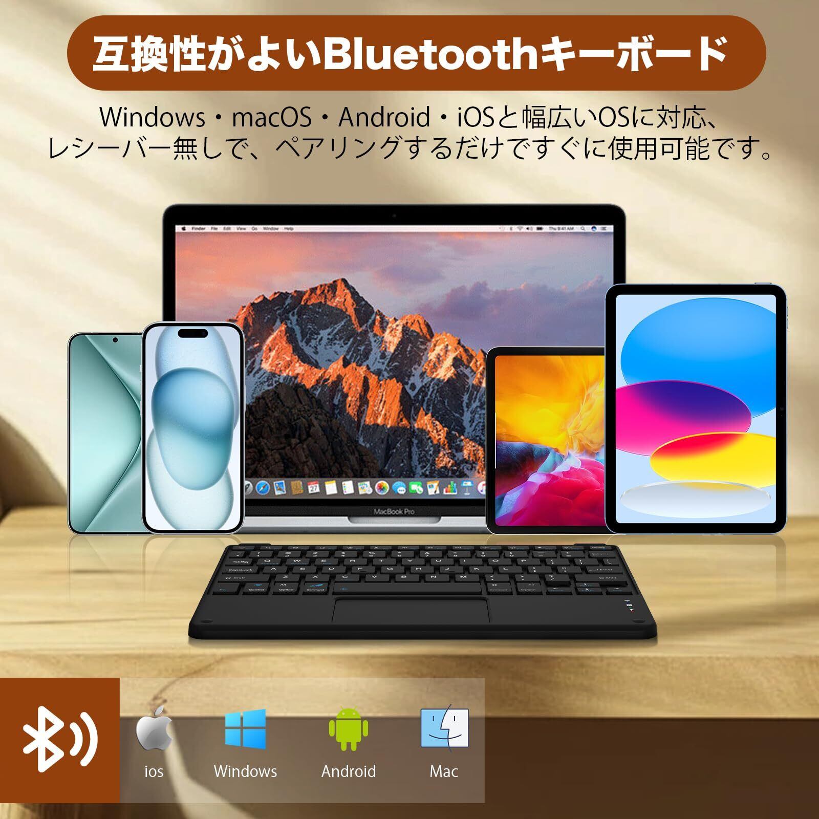 【タッチパッド搭載Bluetoothキーボード – マウス不要のスマート操作】タッチパッドを内蔵し、カーソル操作をマウスなしでスムーズに行えます。Bluetooth接続のみで使用できるため、USBレシーバーの差し替えやポートの占有も不要。一度ペアリングすれば次回から自動接続されるので、初心者でも簡単に使えます。軽量・スリム設計で持ち運びやすく、静音キーによりカフェ・図書館・職場など静かな環境でも快適。出張・旅行・在宅ワークに最適なタッチパッド付きワイヤレスキーボードです。