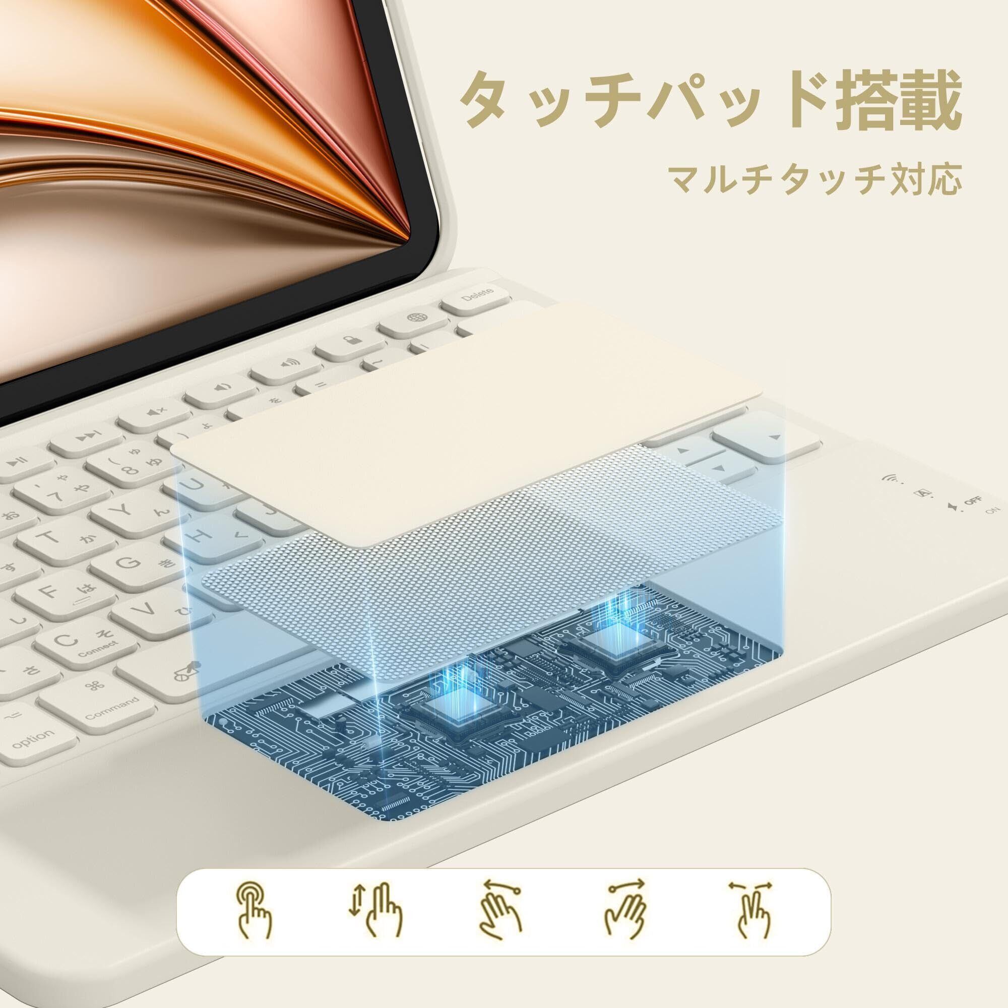 【ipad キーボードJIS日本語配列&タッチパッド搭載】アイパッド キーボードはJIS日本語配列を採用し、ホームボタン・全選択・コピー&ペースト・音楽制御・明るさ調整など13種類のファンクションキーを装備(ワンボタン操作対応)。タッチパッドにより誤作動と反応遅延を解消し、マウスの左右クリック及びスクロール機能を完全再現。iPadOSの全ジェスチャー操作(ピンチズーム/アプリ切り替え等)をサポートします。