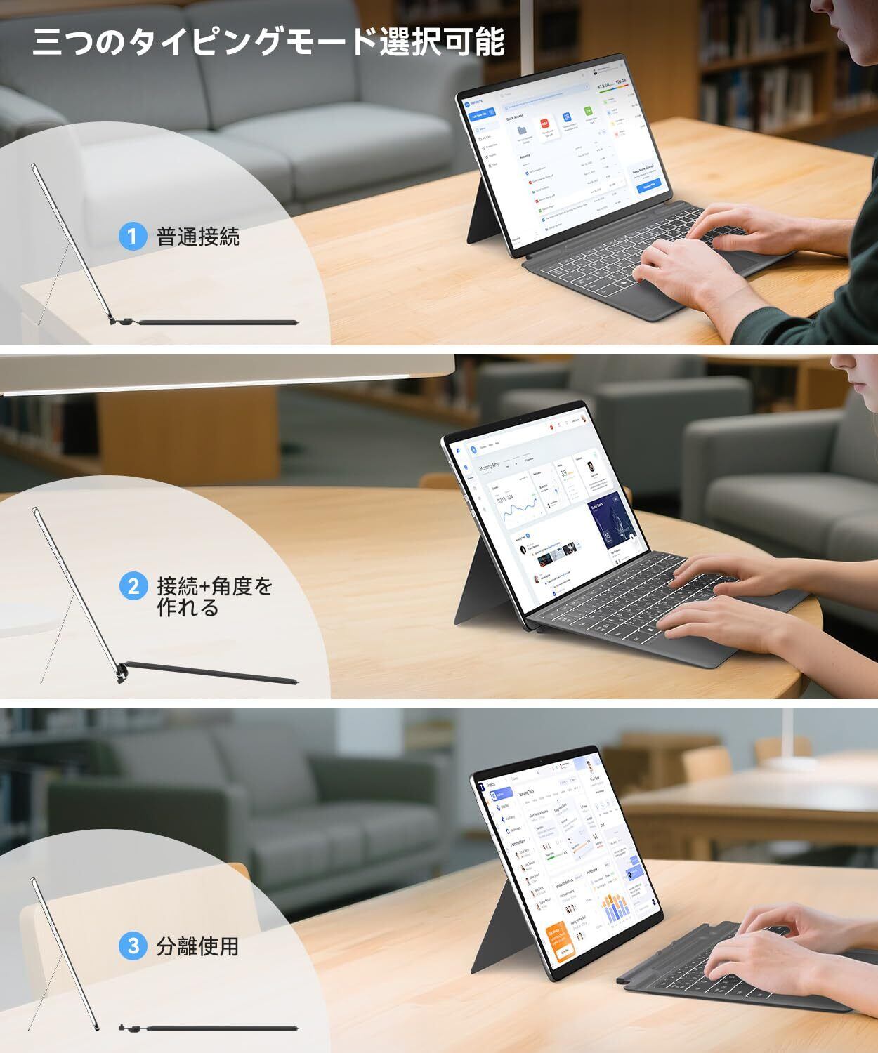【磁石吸引&脱着式&カバー兼用 】サーフェスプロX キーボードはマグネット吸引で、タブレットもすぐにノートパソコンのように使います。 またマグネットの力でモニター側を折りたたんで、タイピングする時に15°の傾斜に作れ、実は腕への負荷をかなり抑えます。
