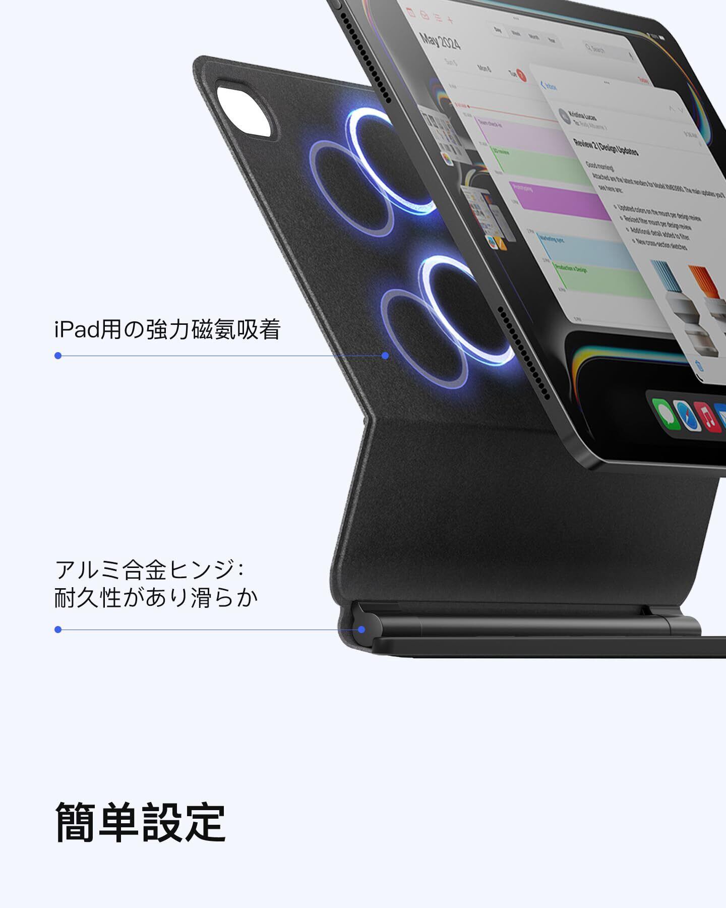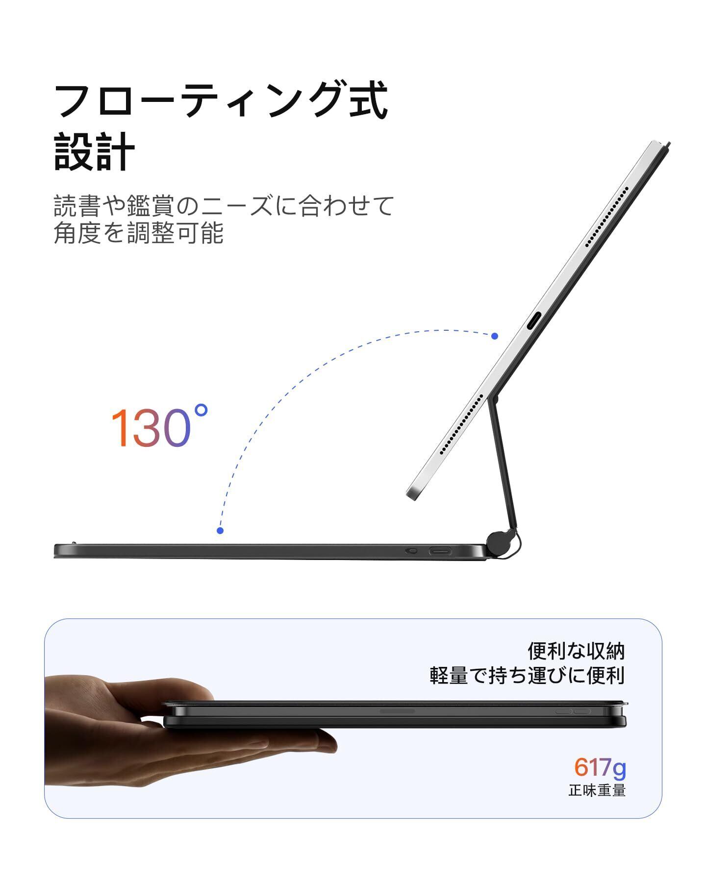 マグネット式フローティングスタンド: 簡単に磁力で取り付け可能で、iPadをノートパソコンのように変身。アルミニウム合金ヒンジにより、130度のチルト角度で快適なタイピングを実現。薄型軽量で持ち運びに便利、旅行やビジネス、勉強に最適です