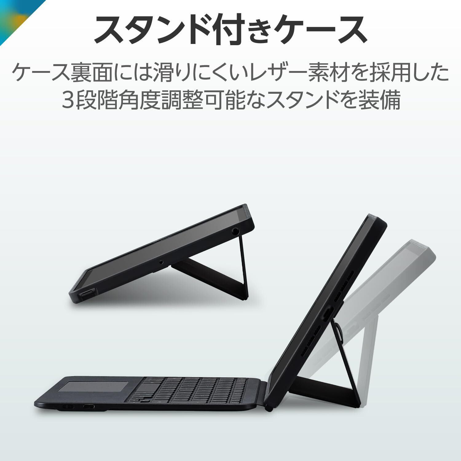 ■ケースの裏面にはスタンドを装備しています。好みや使用シーンに合わせて3段階の角度調整が可能です。スタンドにはラバー素材を使用し、タイピング時の安定性を高めます。