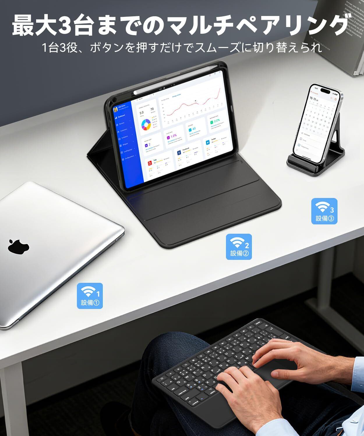 特徴 3台マルチペアリング可能, JIS日本語配列, 多角度調整, 超高精度タッチパッド付き, 軽量薄型キーボード本体