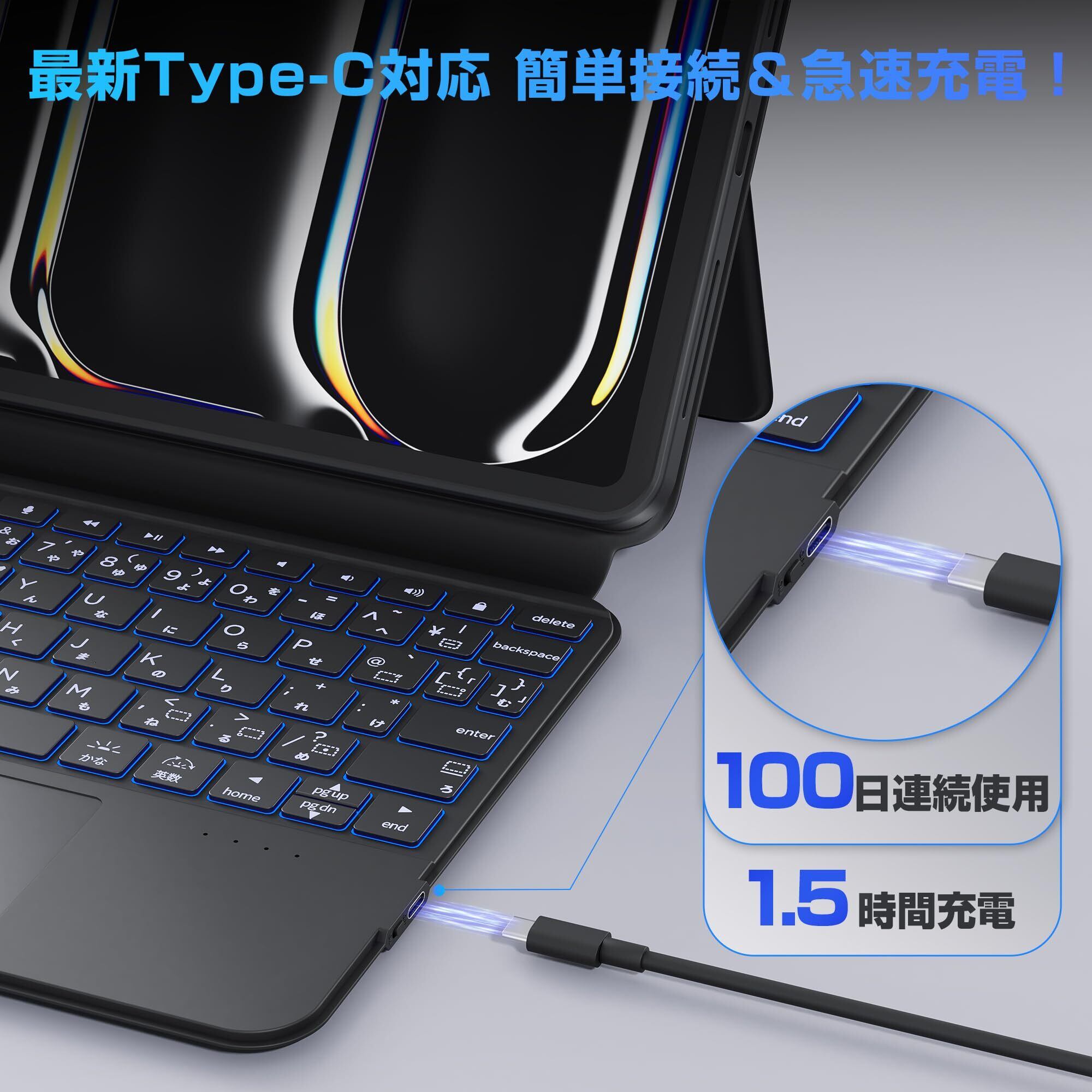 【超薄型&カラフルなバックライト】厚さわずか1.45cm、重量625gのスリム設計で、Apple純正よりも軽量でスタイリッシュなiPadキーボード。7色のバックライトと3段階の明るさ調整により、夜間でも快適なタイピングが可能です。バックライトOFFで最大220時間、ONで最大6時間の連続使用が可能です。