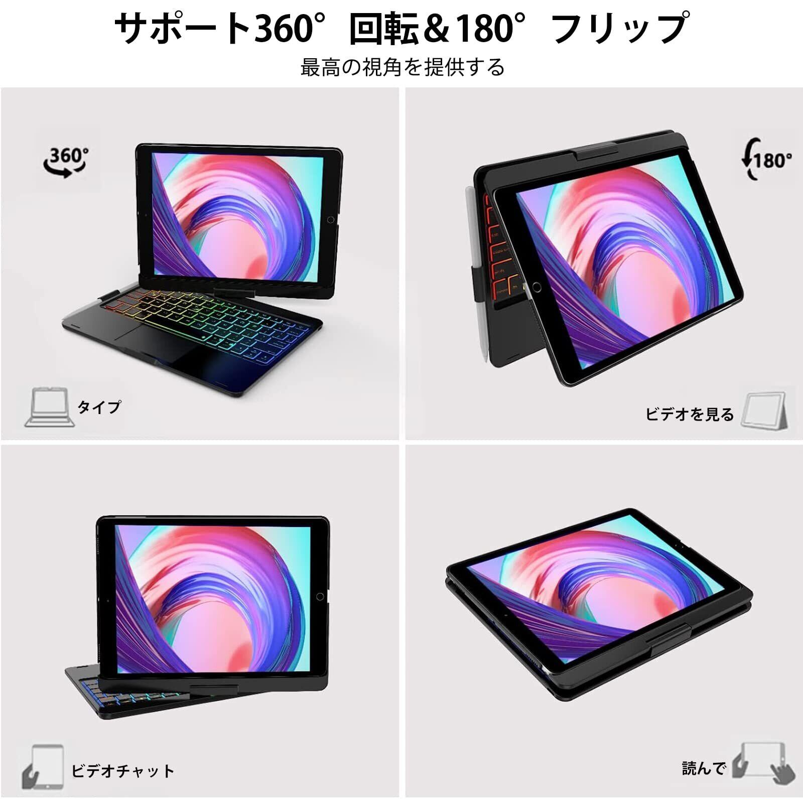 【360°回転&180°フリップ】 iPad 第9/8/7世代用キーボード付きケースはiPadをノートパソコンように使用できる以外に、7つの異なるモードで使用できます。どんな角度にも調整でき、画面を360度回転でき、180°裏返す操作し、横向きに立てかけて、お気に入りの番組を視聴したり、絵を描くんだり、読書、WEBなどを楽しめます。キーボードが不要な時、iPadケースを反転できます。ミーティングや仕事など実用性が高くて便利なbluetooth iPad 10.2インチ キーボードケースです。
