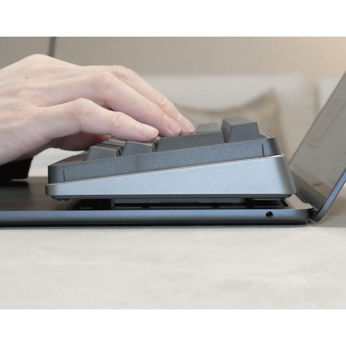 置き位置の工夫で、外付けキーボードの脚を立てた傾斜での利用も可能。 ※HHKBシリーズで確認済み