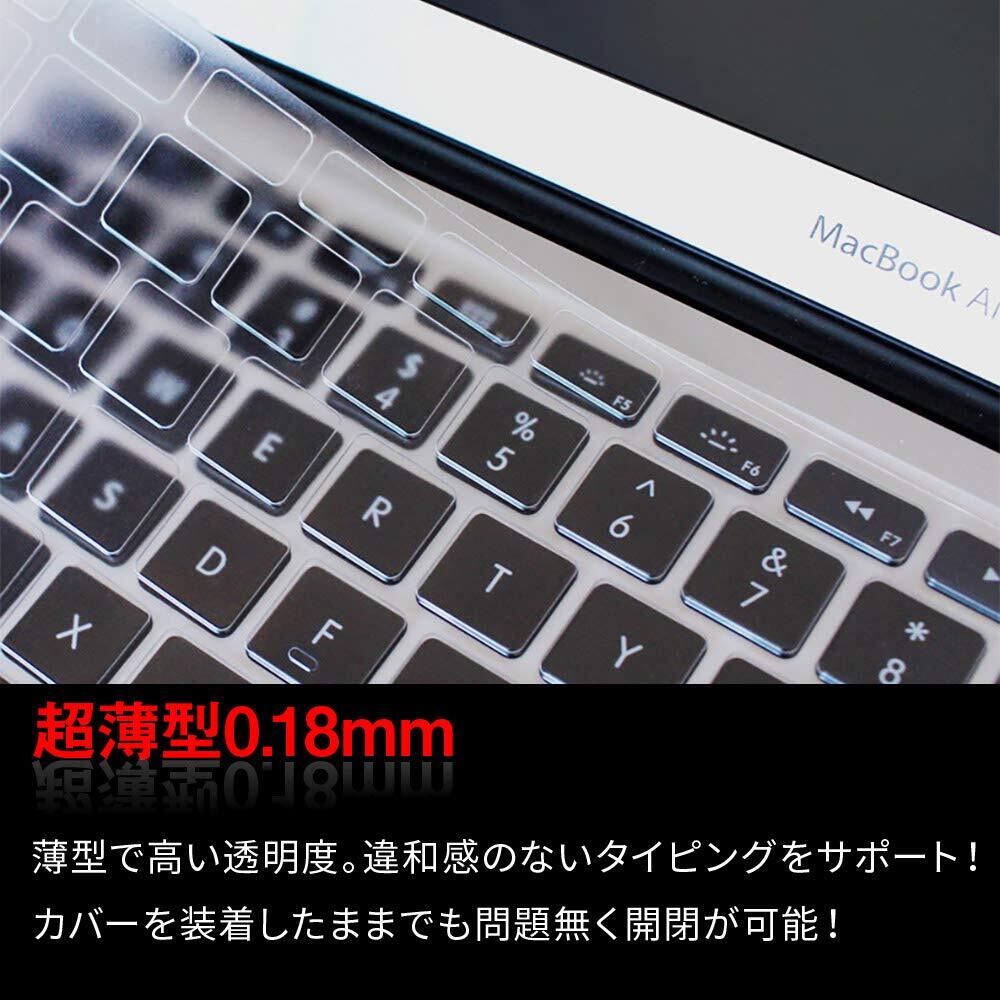 【超薄型0.18mm】薄型で高い透明度。違和感のないタイピングをサポートします。カバーを装着したままでもmacbookの開閉に影響を及ぼすことがありません。