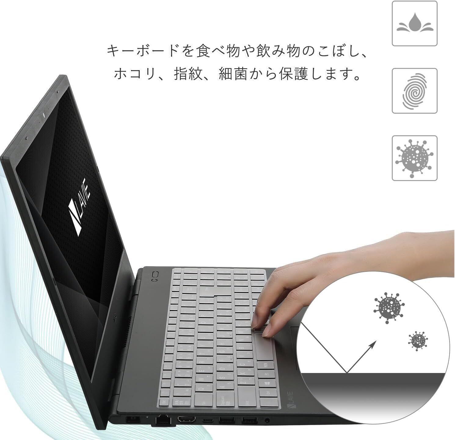 【全面保護】ホコリ、汚れ、指紋、水飛沫などから完璧に保護します。防水・防塵。ホコリや汚れ、食べ物・飲み物の不意なこぼれなどからキーボードを安全に保護します。