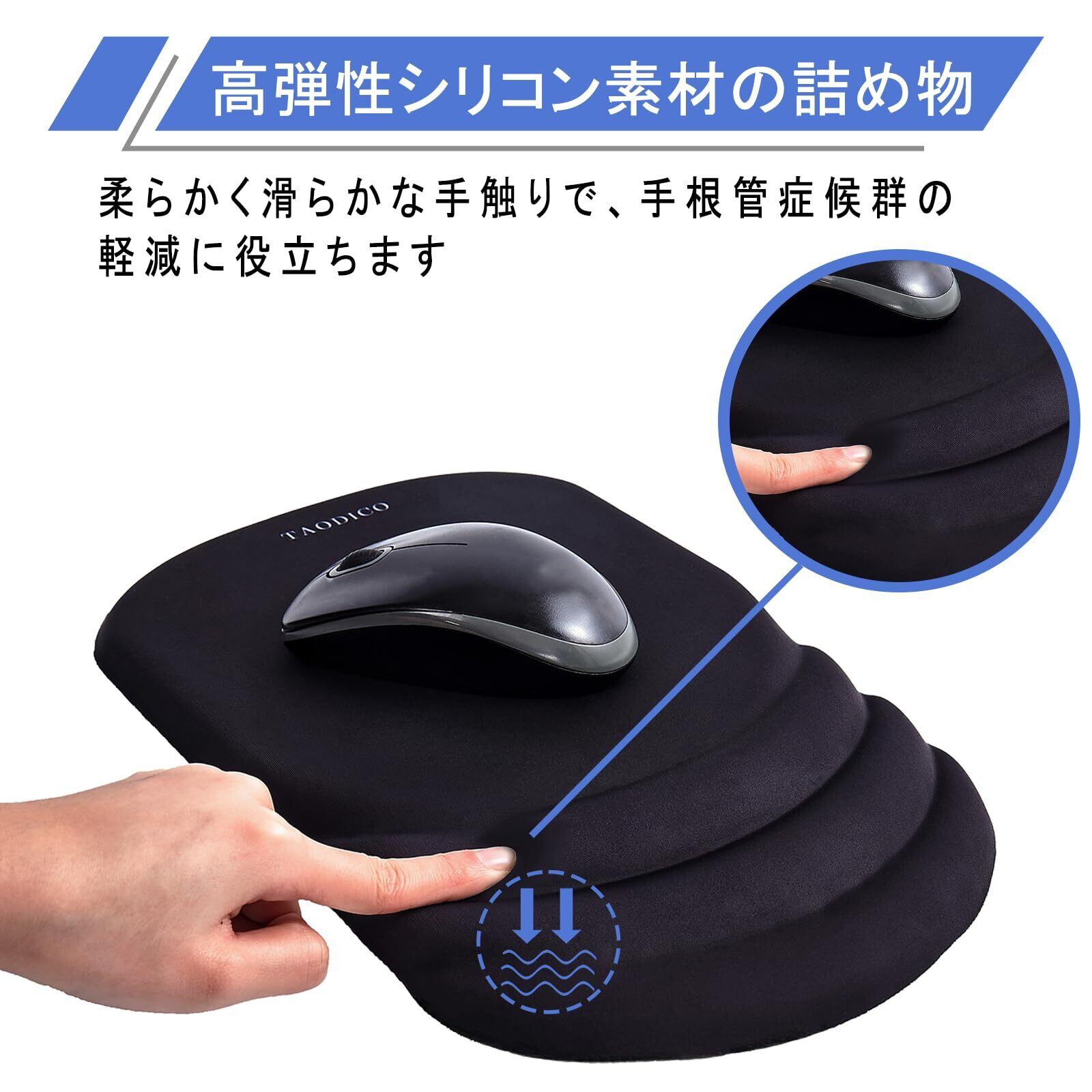 人間工学マウスパッド リストレスト付き ミルクシルク生地 丈夫なシリコン充填 滑り止め ポリウレタンベース マッサージデザイン 痛み緩和マウスパッド ワイヤレスマウスとデスク用 30.5x20.34cm ブラック