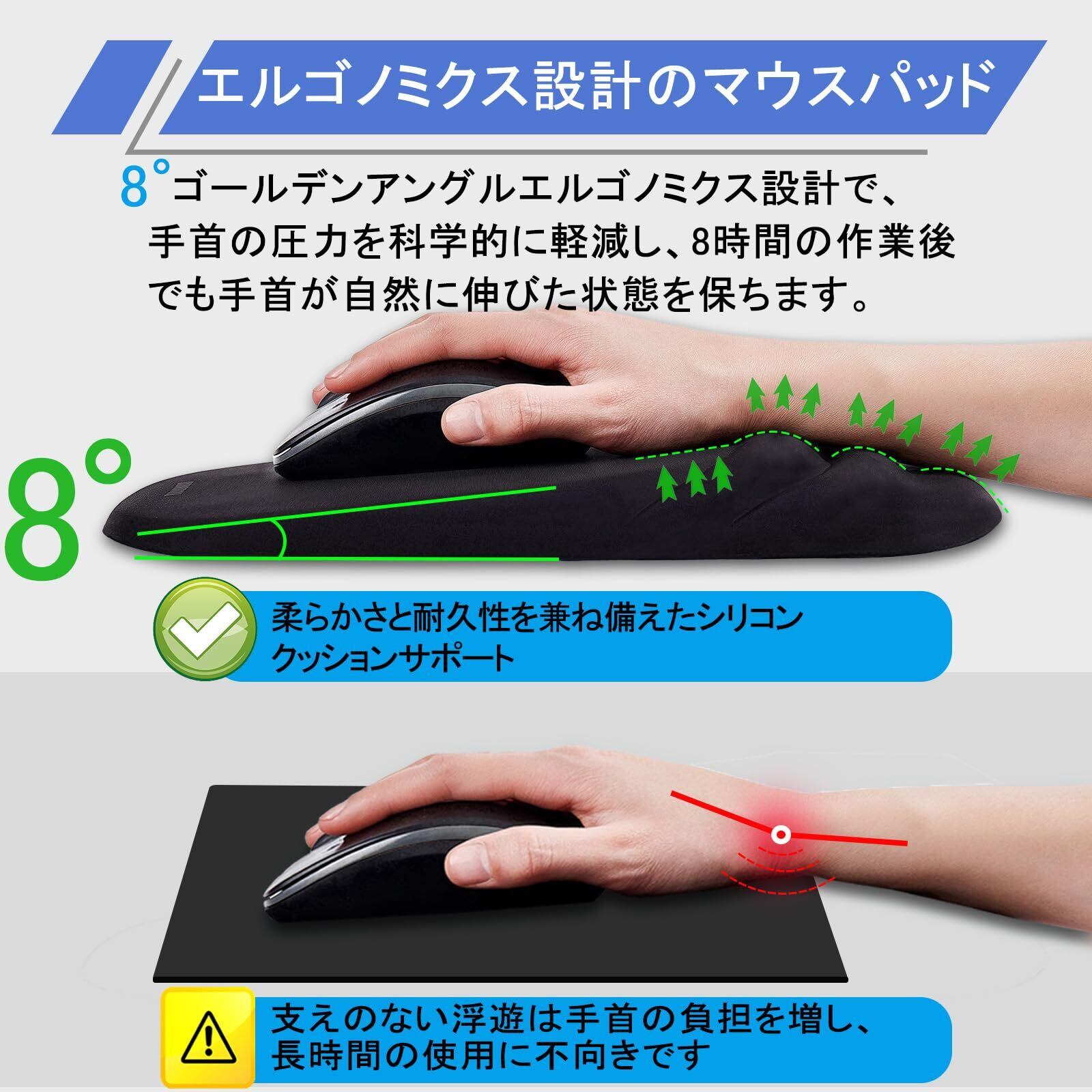 リストレスト付き人間工学に基づいたマウスパッド:8度の傾斜と勾配のリッジデザイン、自然な手首のカーブに沿い、負担を軽減し、RSIのリスクを軽減します。 人間工学に基づいたリストレスト:革新的な8度の傾斜とグラデーションリッジデザインは、人間工学に基づいた方法で手首と腕を完全にサポートします。 従来のジェルフィリングとは異なり、耐久性のある高反発シリコンフィリングを採用し、手首にフィットし、長時間のマウス使用による不快感を軽減します。