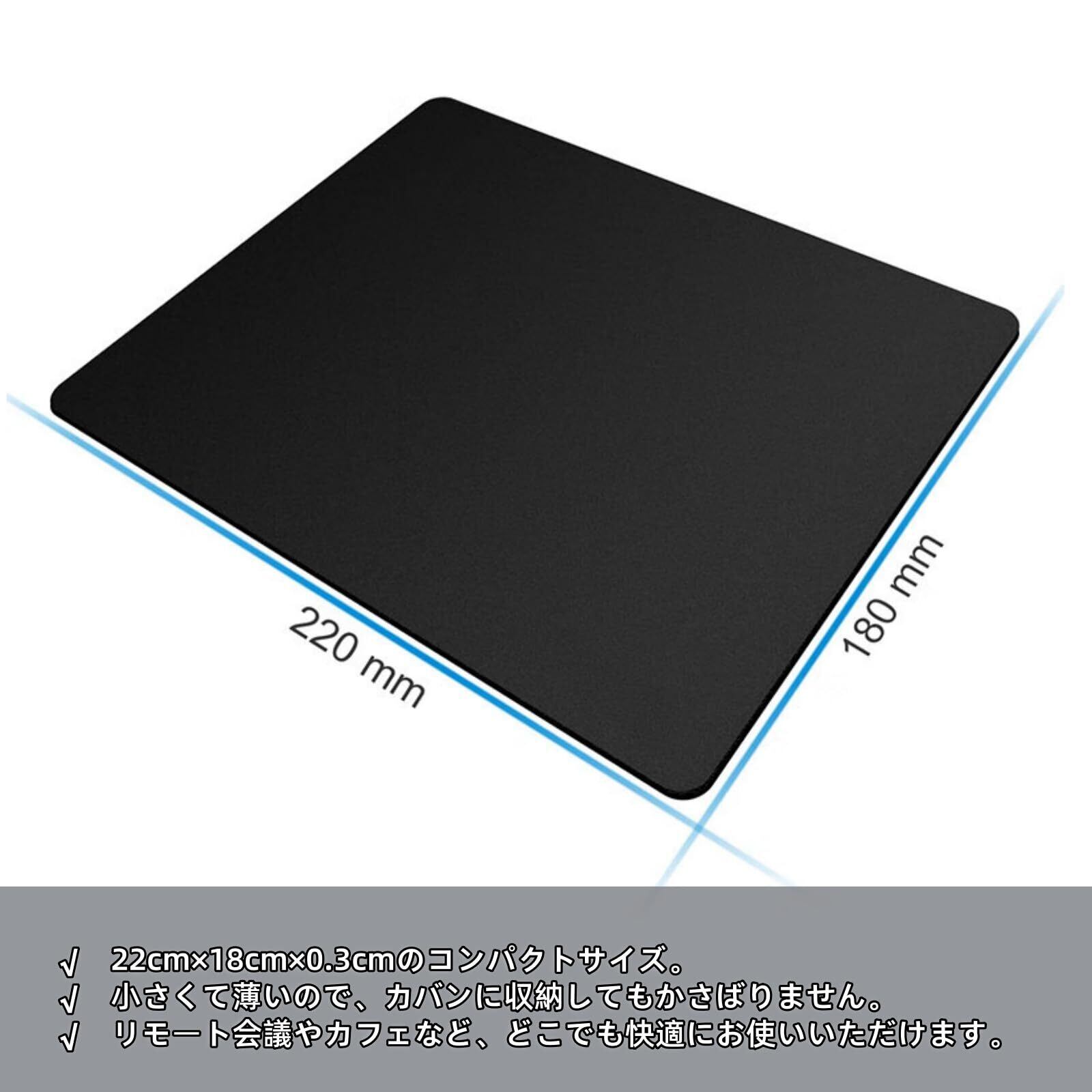 22cm×18cm×0.3cmの小さめサイズのミニマウスパッドです。コンパクトに収納できるので、リモート会議やカフェなど外出先での作業に最適です。(1箱に1枚入り)