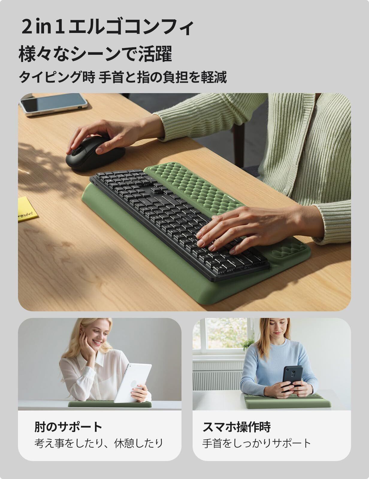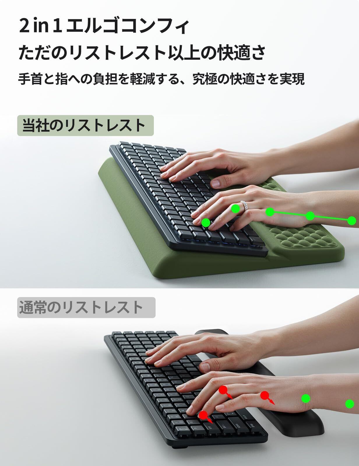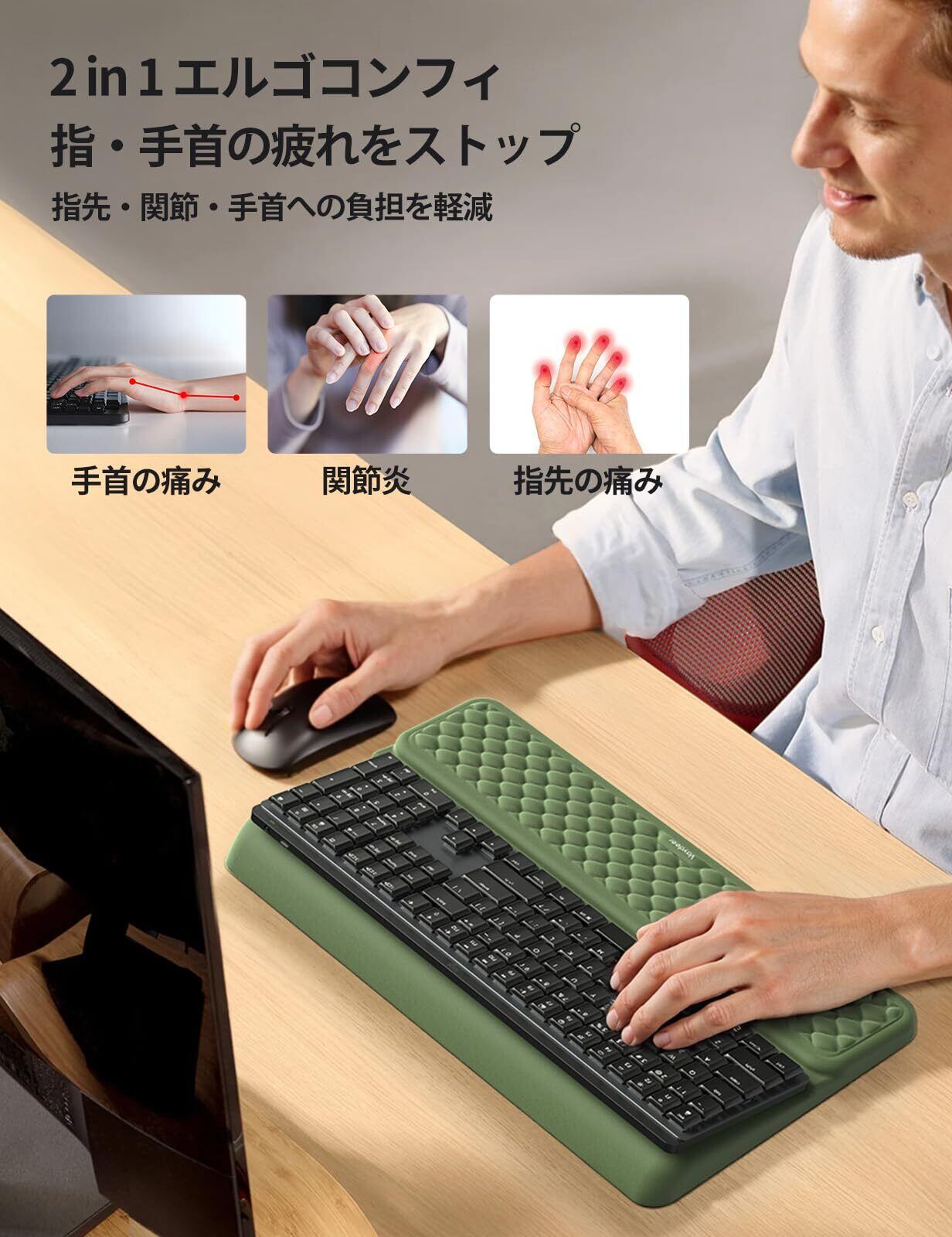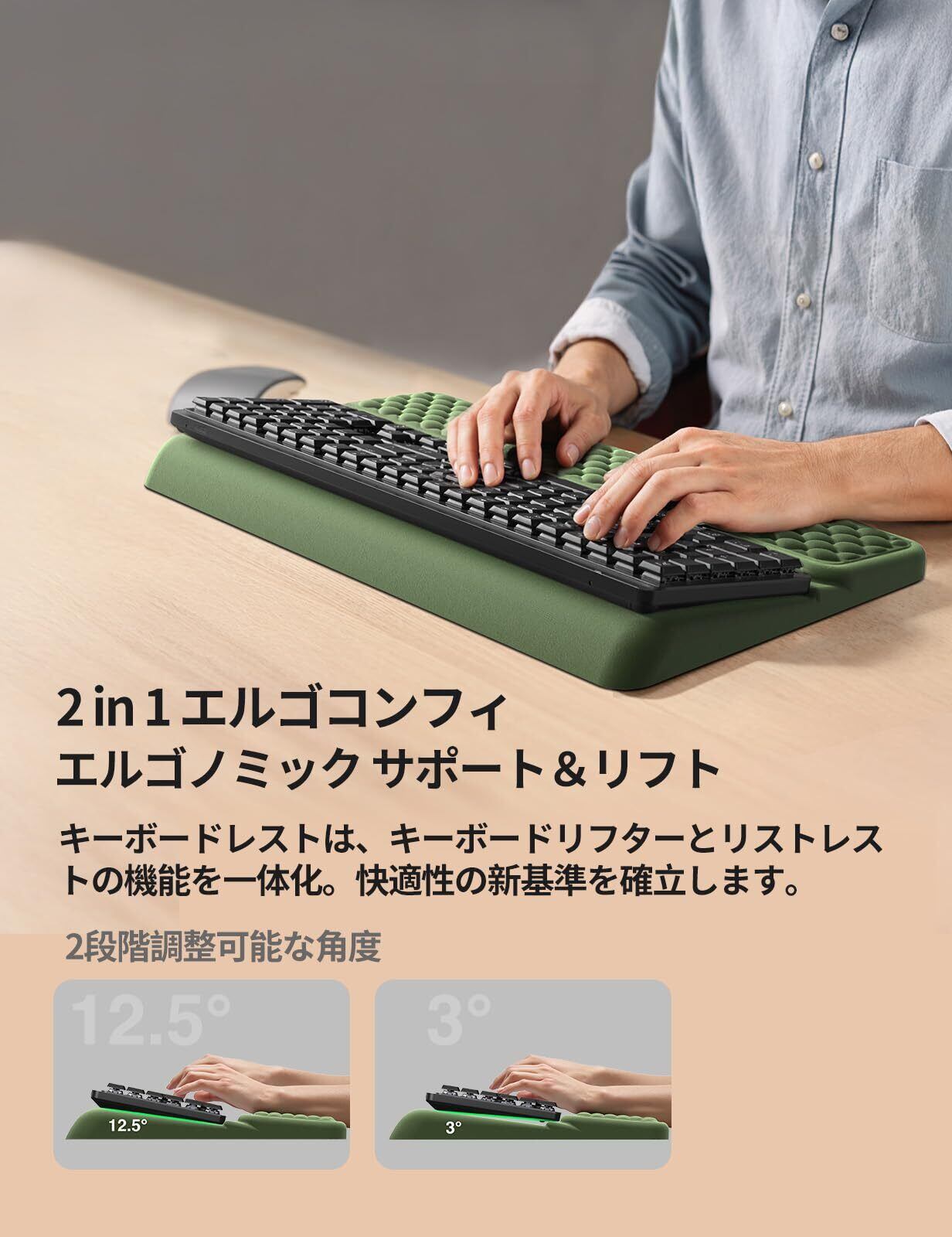 【素晴らしい手首セーバー】このデスク用アームレストは、キーボードを高め、手首を快適な高さにサポートし、手首が痛くならず、手の炎症や心皮のトンネルの問題を効果的に緩和します。 アーミーグリーン仕上げのパームレストは、デスクのセットアップにまとまりのあるスタイリッシュなタッチを加えます。