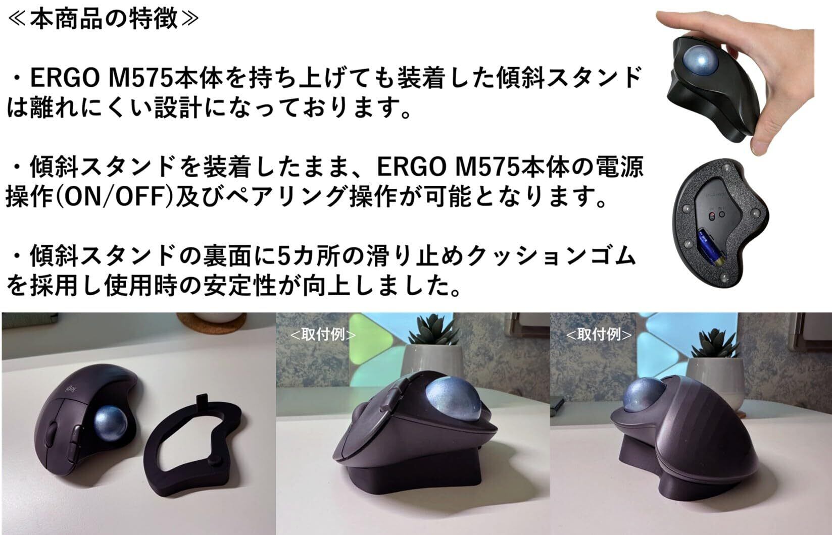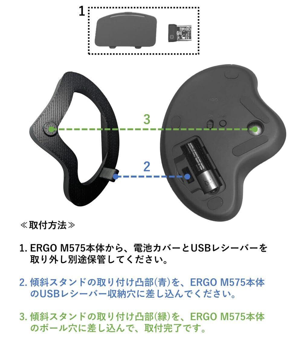 【簡単な取付】1. ERGO M575本体から、電池カバーとUSBレシーバーを取り外し別途保管してください。2. 傾斜スタンドの取り付け凸部(青)を、ERGO M575本体のUSBレシーバー収納穴に差し込んでください。3. 傾斜スタンドの取り付け凸部(緑)を、ERGO M575本体のボール穴に差し込ん差し込んで、取付完了です。
