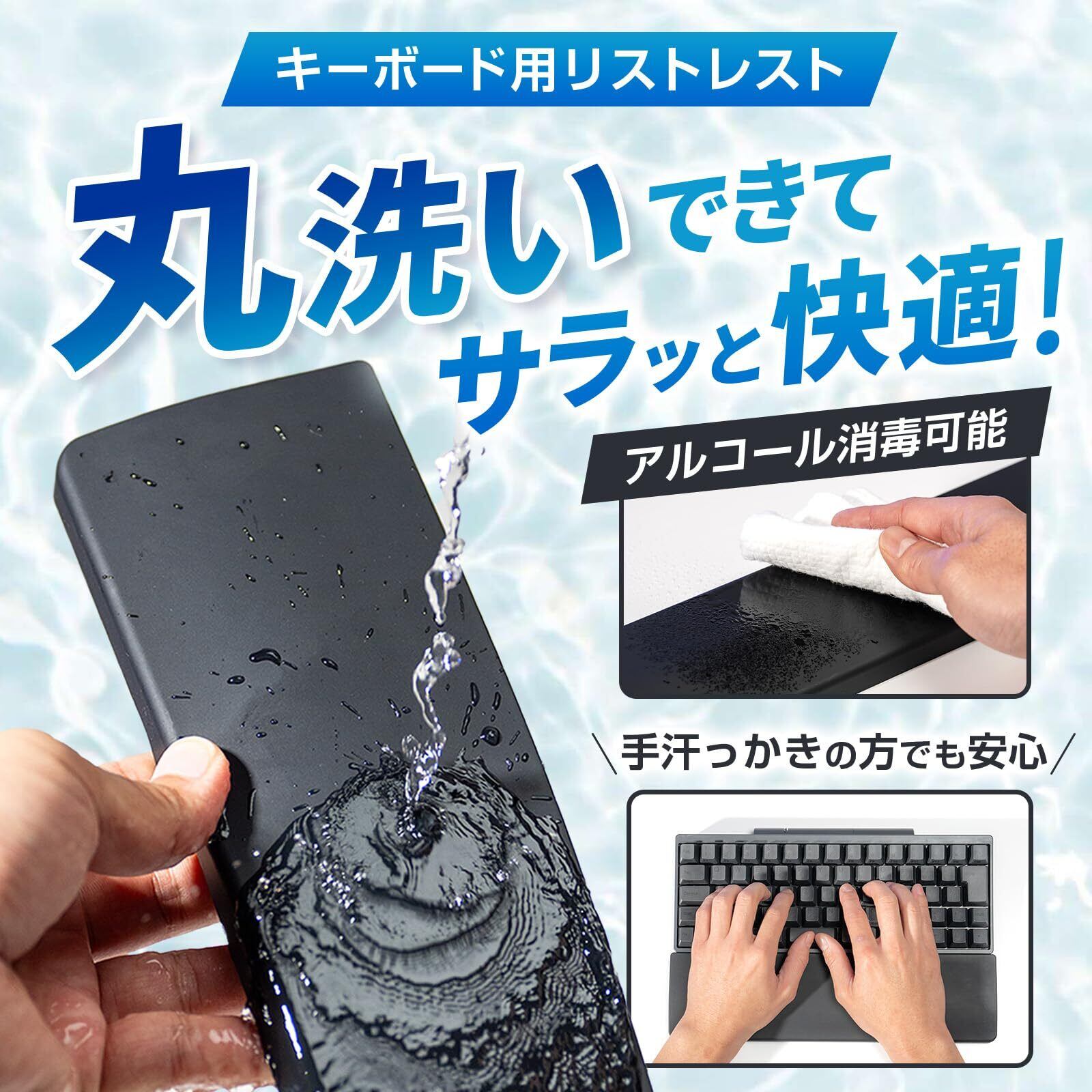 【丸洗いができるシリコン製リストレスト】全面シリコン製なので、丸洗いができて衛生的。手汗が気になる方も安心して使えます。アルコール消毒も可能。キーボード操作時の手首角度を快適にします。