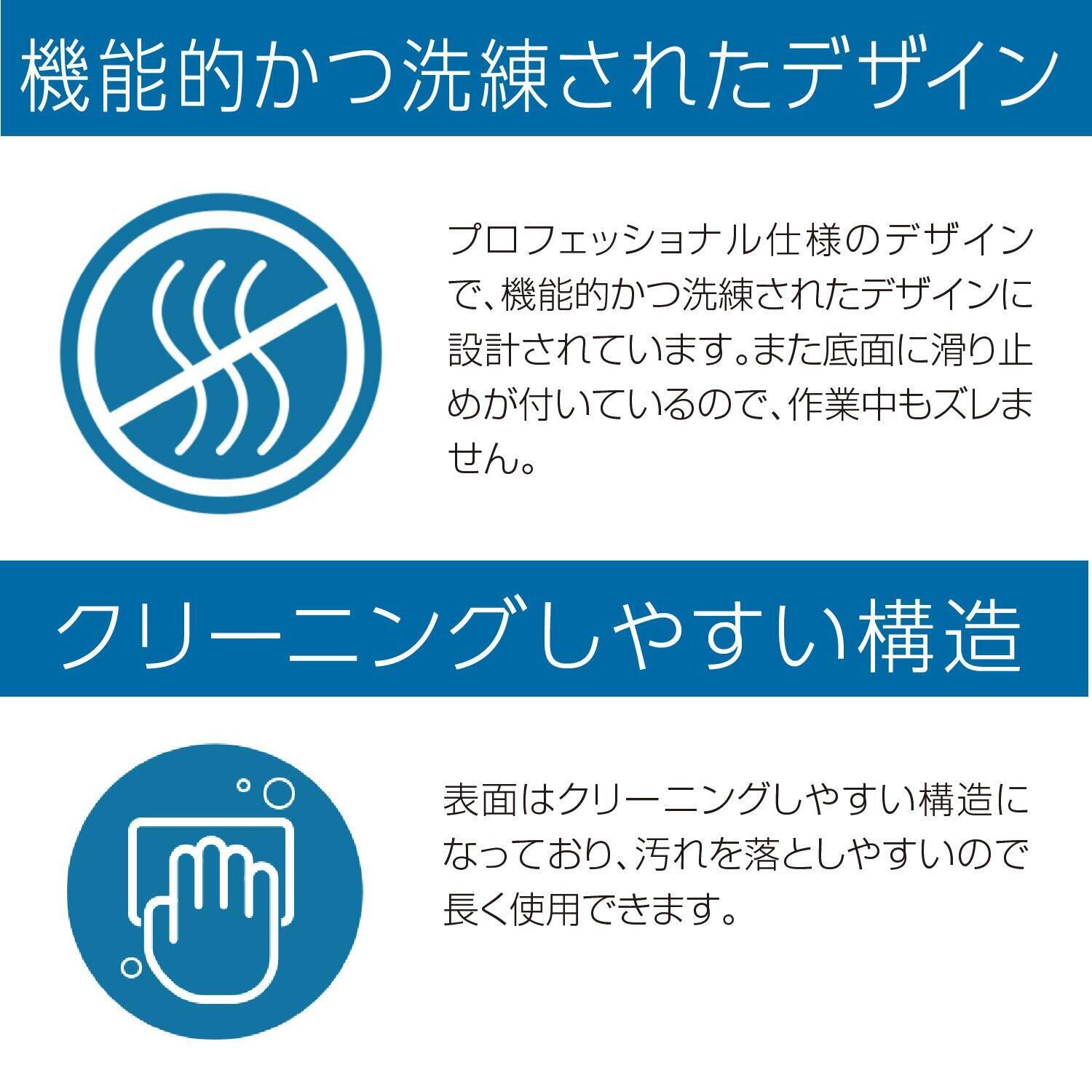 プロフェッショナル仕様のデザインで、機能的かつ洗練されたデザインに設計されています。また底面に滑り止めが付いているので、作業中もズレません。