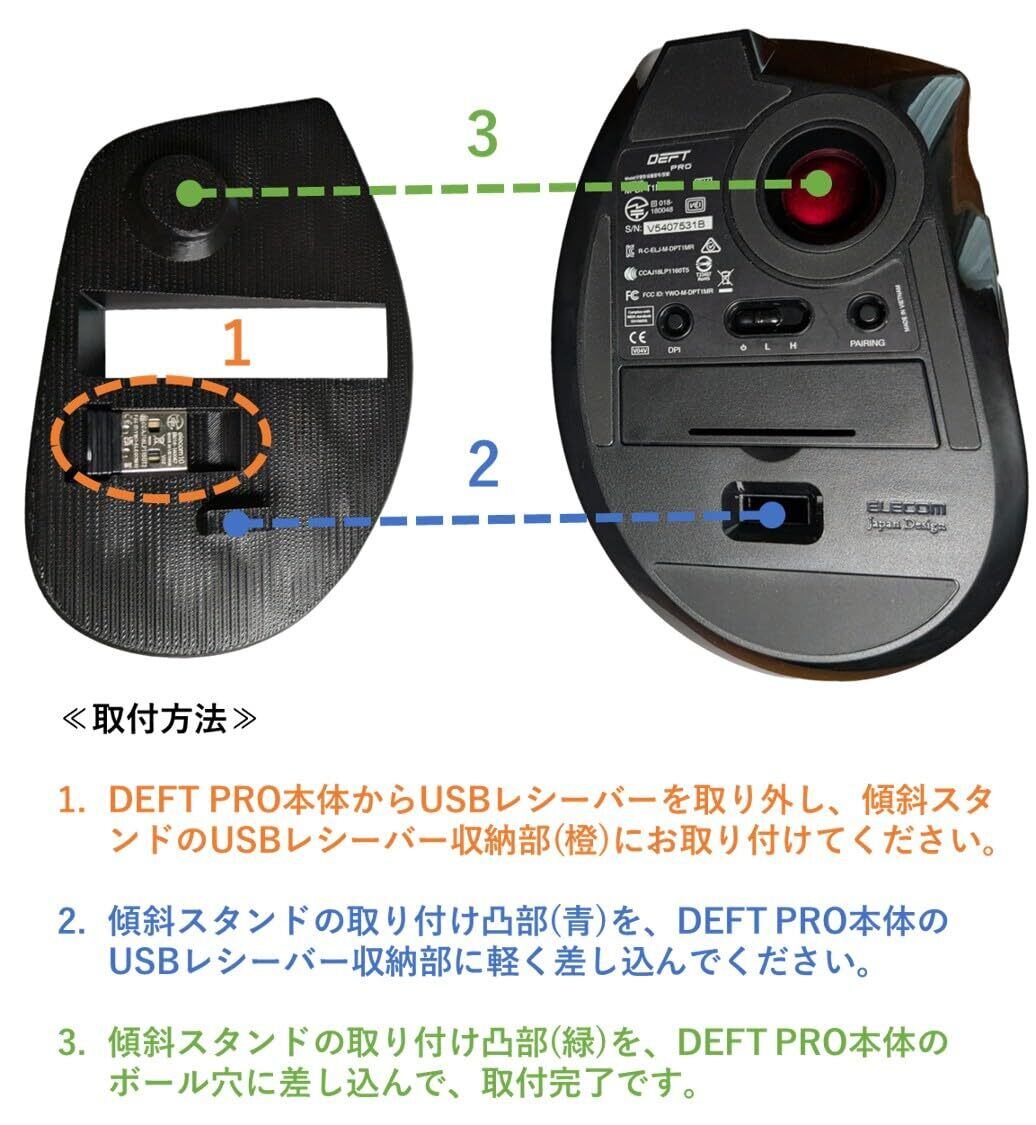 【簡単な取付】1. DEFT PRO本体からUSBレシーバーを取り外し、傾斜スタンドのUSBレシーバー収納部(橙)にお取り付けてください。 2. 傾斜スタンドの取り付け凸部(青)を、DEFT PRO本体のUSBレシーバー収納部に軽く差し込んでください。 3. 傾斜スタンドの取り付け凸部(緑)を、DEFT PRO本体のボール穴に差し込んで、取付完了です。