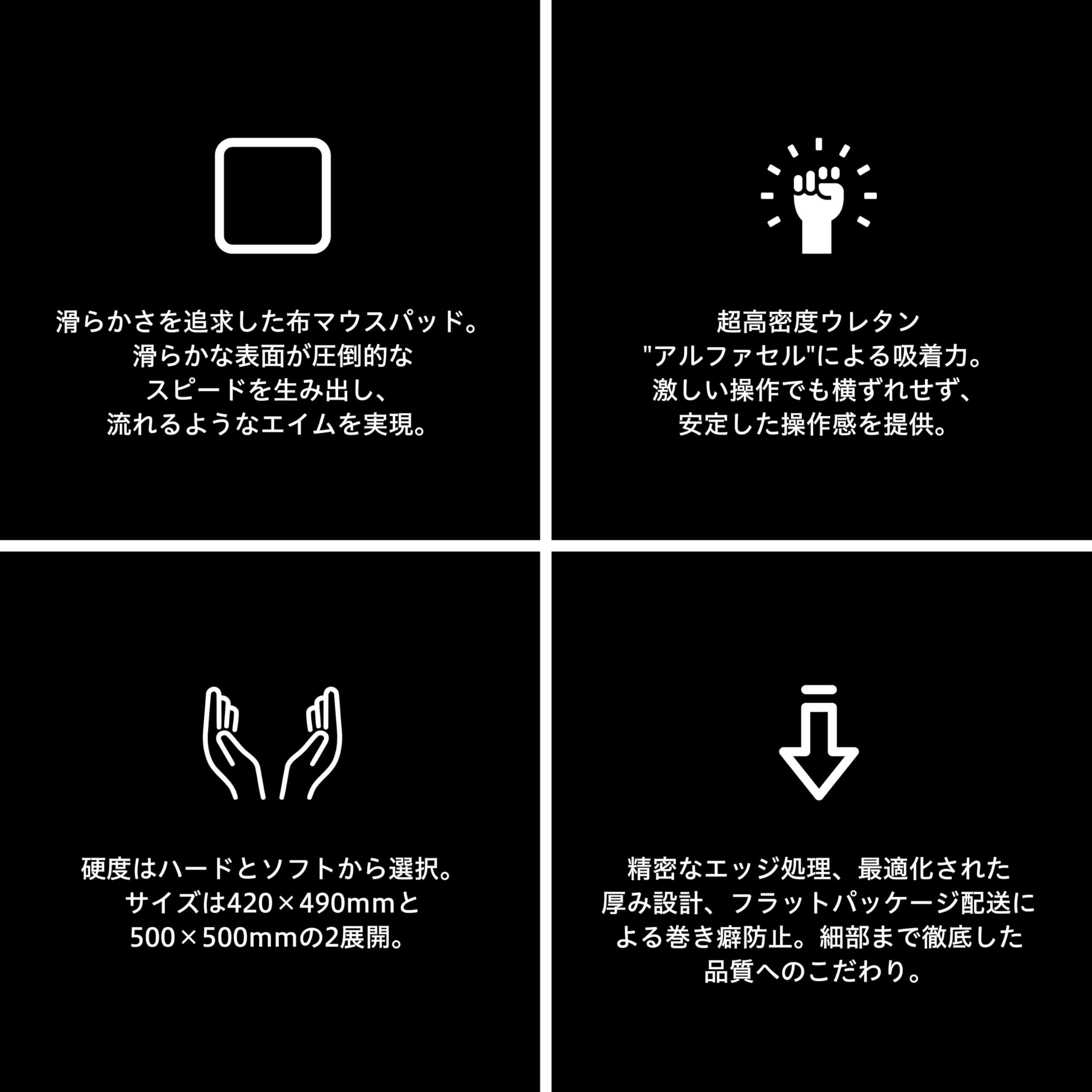 アルファセル採用。動くのは、マウスだけ ー 裏面に超高密度ウレタン"アルファセル"を採用しました。吸着力にも優れ、激しい操作でもマウスパッドが横ずれを防止。圧倒的なスピードでありながら安定感を提供します。