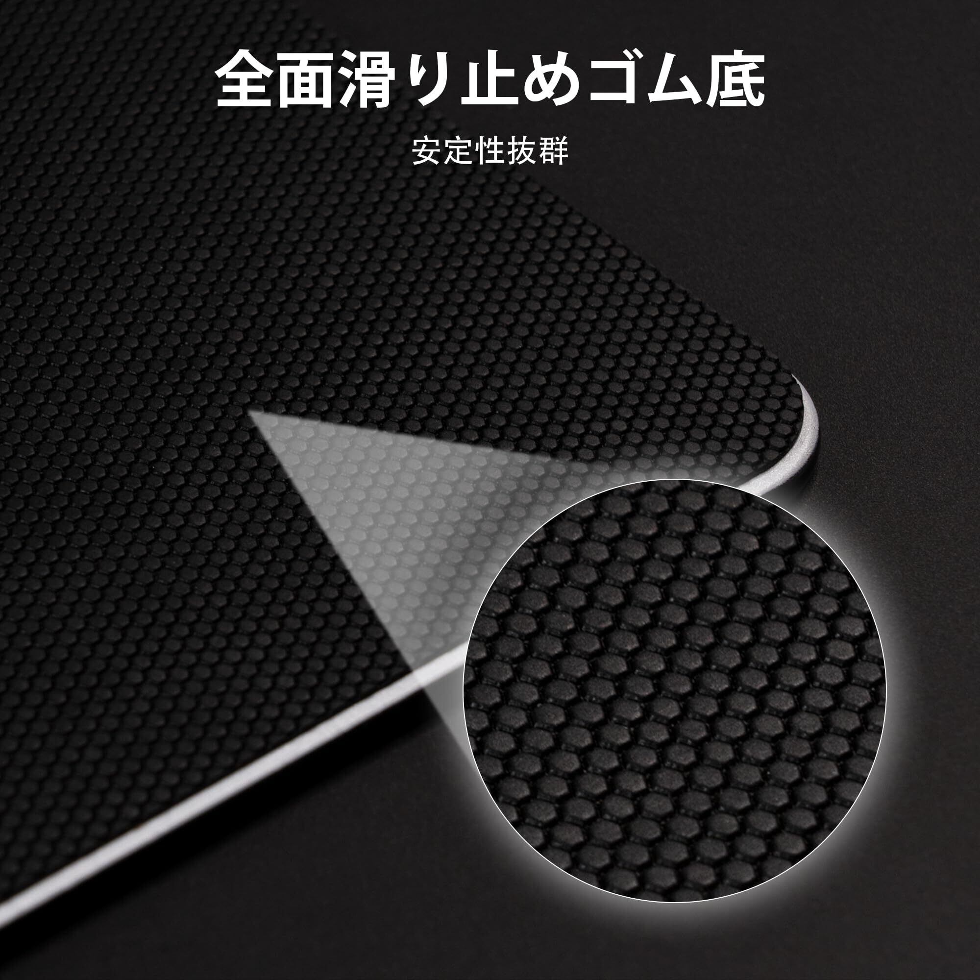 【滑り止めゴム底面】全面ゴムベースがデスクに強力に固定。ガラス層内のデザインを固定するとともに、長時間ゲームでも位置ズレを防ぎます
