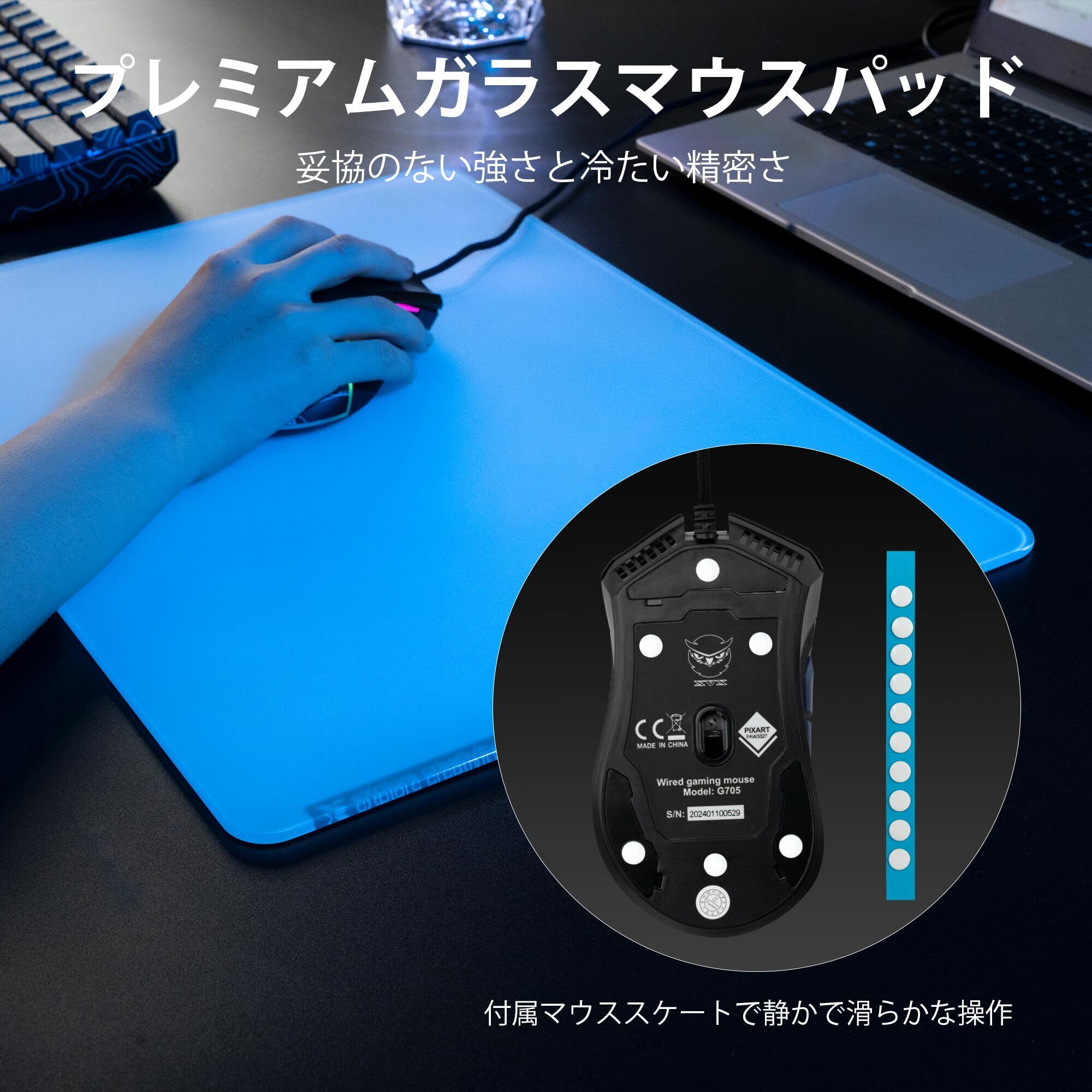 【高精度トラッキング】微細エッチング加工を施した強化ガラス表面は、独特の滑らかさでマウスの追従性を最大化。光学センサーとの相性に優れ、摩擦を抑えた高速操作を実現。競技プレイヤーの筋肉記憶形成を支える、比類ない表面均一性が特徴です