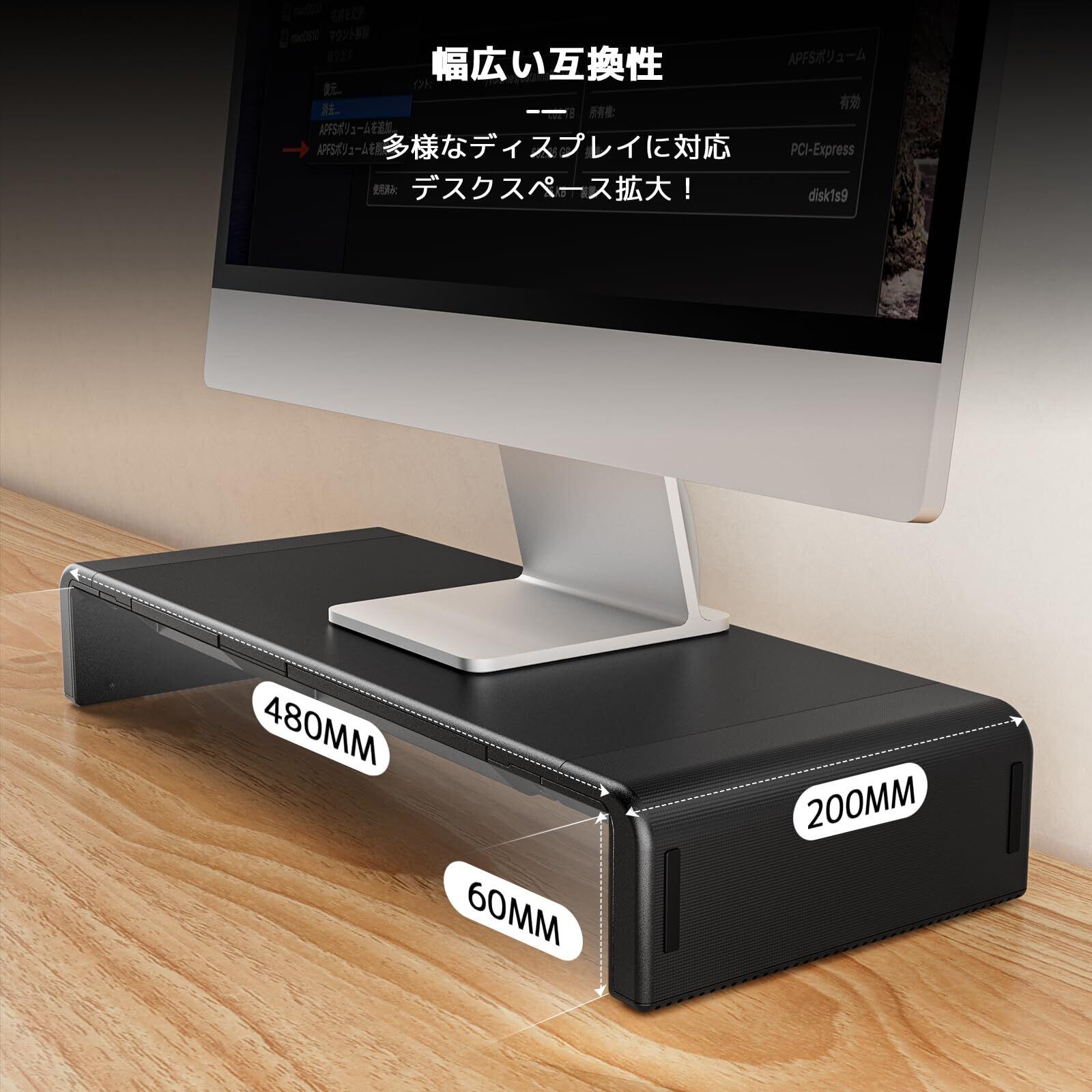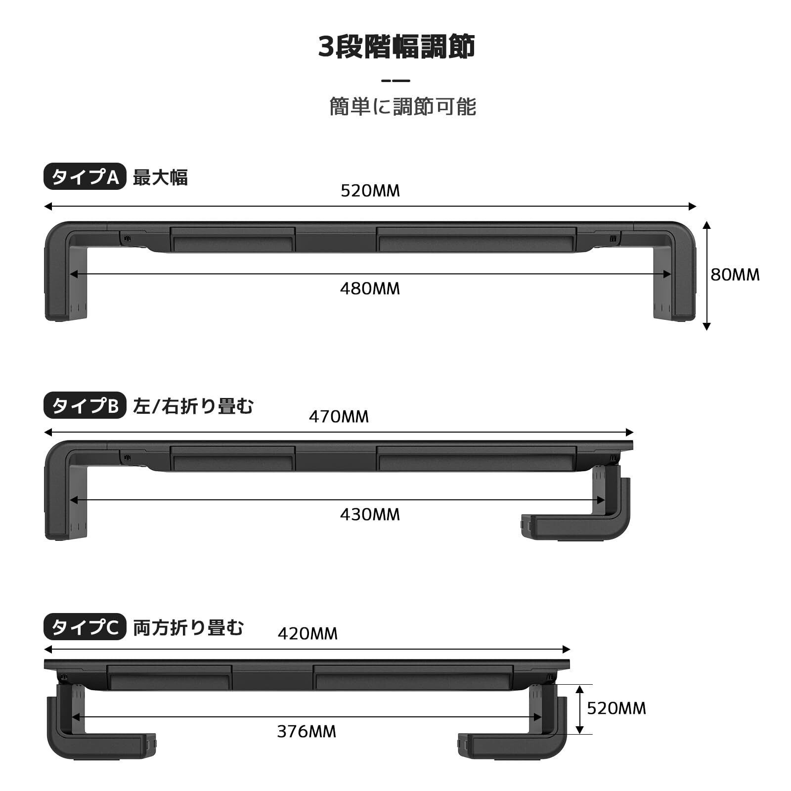 三段階の幅調整可能:モニター台をご自身の好みとデスクの広さに合わせて、横幅を三段階(420mm、470mm、520mm)に調節できます。さまざまなモニターをサポートできます。