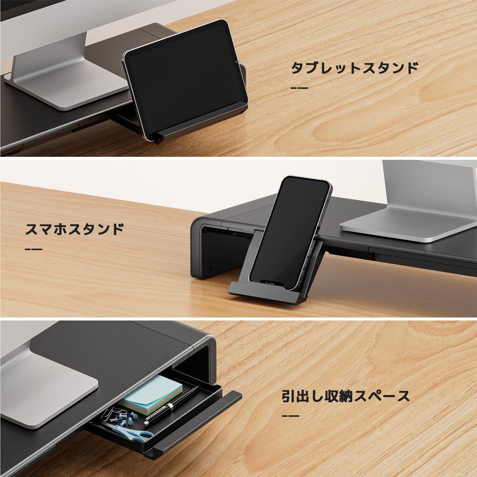 有効なスペースを向上させ:スタンドの下にキーボードやマウス、ゲーム機やノートパソコンなどを収納できるスペースがあります。また、引き出し、スマホやタブレットスタンドも付いているので、デスク周りをキレイに整理し、スペースを有効活用できます。