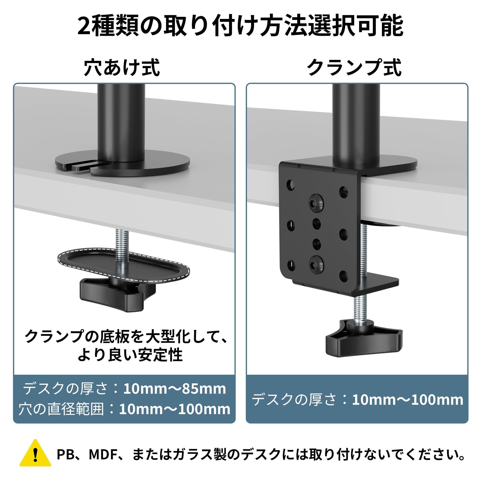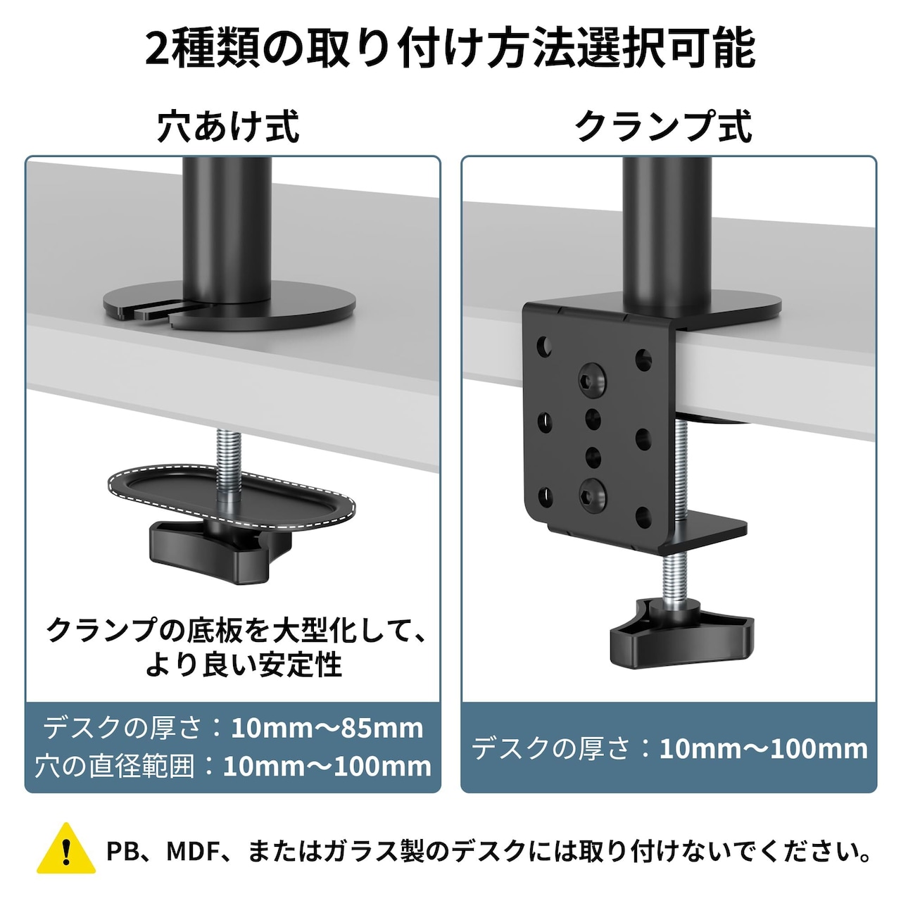 グロメット式およびクランプ式の両方に対応しており、デスクの厚さに応じて最適な取り付け方法をお選びいただけます。安定した固定により、大型モニターでも安心して使用可能です。
