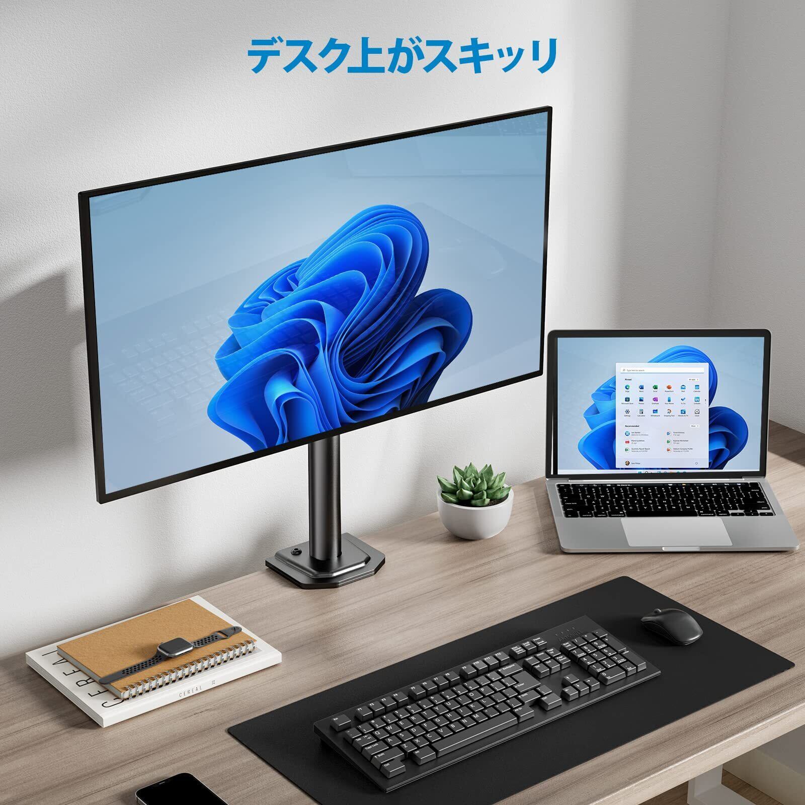 【デスク上のスペースをスッキリ】モニターアームを使うことでスタンド部分が無くなり、ディスプレイを浮かせて設置できるため、ディスプレイの下のスペースが生まれて机の上を広々と使うことができるようになります。