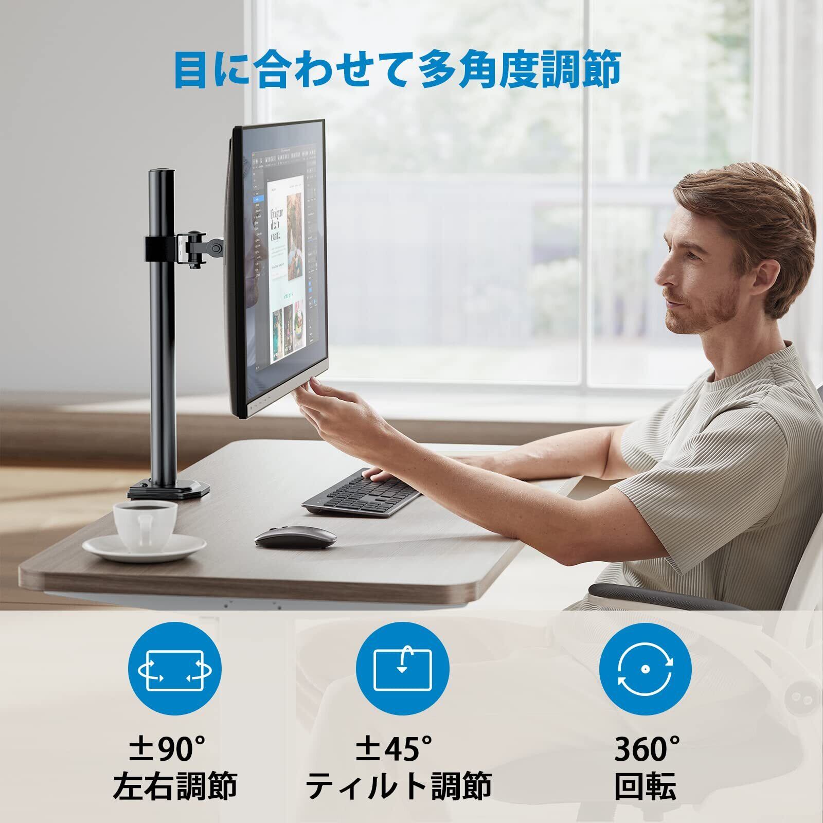 【ディスプレイ角度を自由に変えれる】(1)アーム:移動で高さ調節 (2)VESAプレート部:上向き45°、下向き45°、回転360°、左右各90°。角度や距離などが自分に合って、前後左右に加えて上下も好みの位置に軽々と動かすことができます。ビジネスでの利用はもちろん、トレーダーやゲーマーの方にもおすすめです。