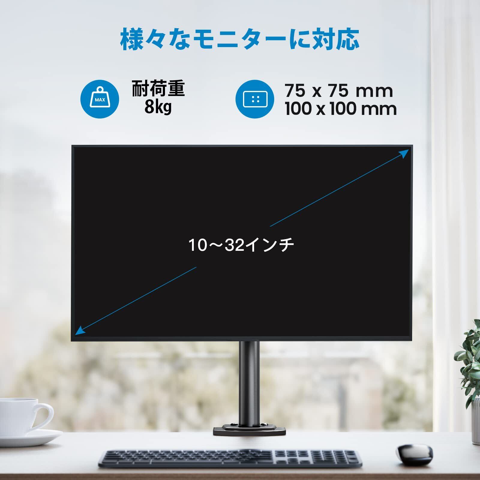 【ご購入前のチェックポイント】(1)モニターのサイズは10~32インチまで (2)モニターとモニターアクセサリーの重量は1~8kg以内 (3)75mm*75mmと100mm*100mmのVESA規格に対応 (4)取付可能天板:厚さ10mm~80mm。