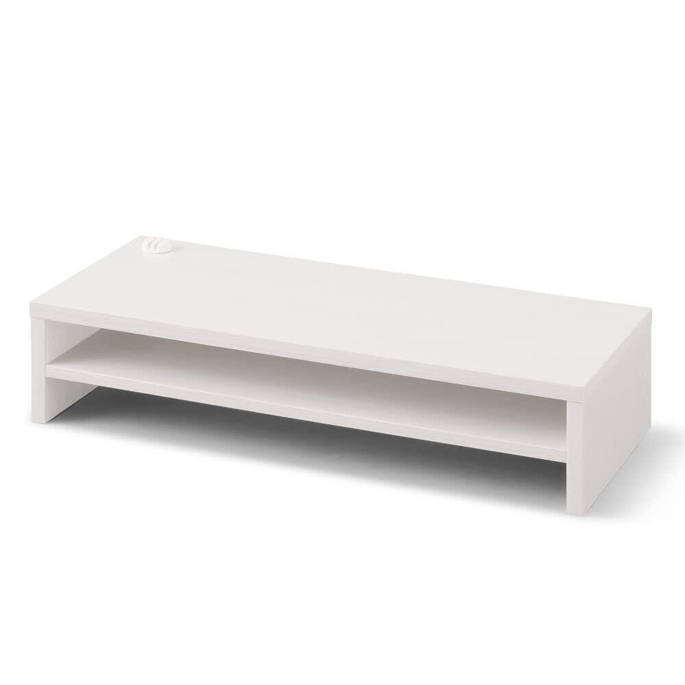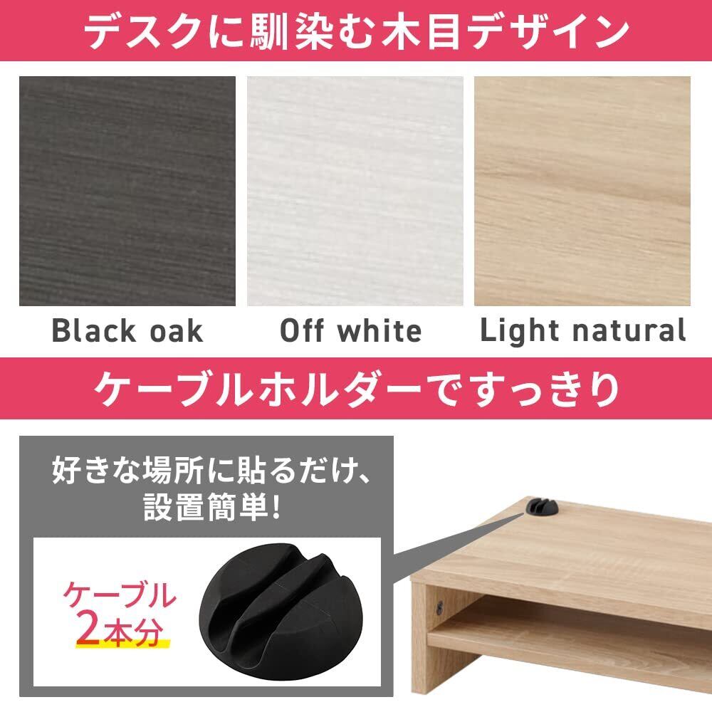 サイズ:幅59cm | カラー:ホワイト | パターン(種類):収納棚付き 棚板付きモニター台で快適な作業環境に! ◆棚板付きで収納力をUP! 作業スペースをより広く使いやすい幅59cm。デスク周りの小物を収納できる棚付きだから、デスクをすっきり整えより広々と使えます。収納棚は取り出しやすいオープンタイプ。出し入れの多い小物や、書類等の収納にぴったりです。シンプルなデザインで耐荷重10kg(天板のみ)。プリンター台や小型テレビの台としても使用可能です。◆目線を上げて、姿勢を改善モニターを適切な高さにすれば、首や肩の負担が軽くなります。背筋も伸びて自然と美しい姿勢に。◆ウェブカメラ越しでも顔や表情がスッキリと映るやや高いアングルからだと、顔がスッキリ明るく映ります。テレワークやオンライン授業でも、カメラ映えするポジションに。◆ケーブルホルダーですっきりケーブルをきれいに整理整頓できるケーブルホルダー。好きな場所に貼るだけだから、設置も簡単。お客様組立