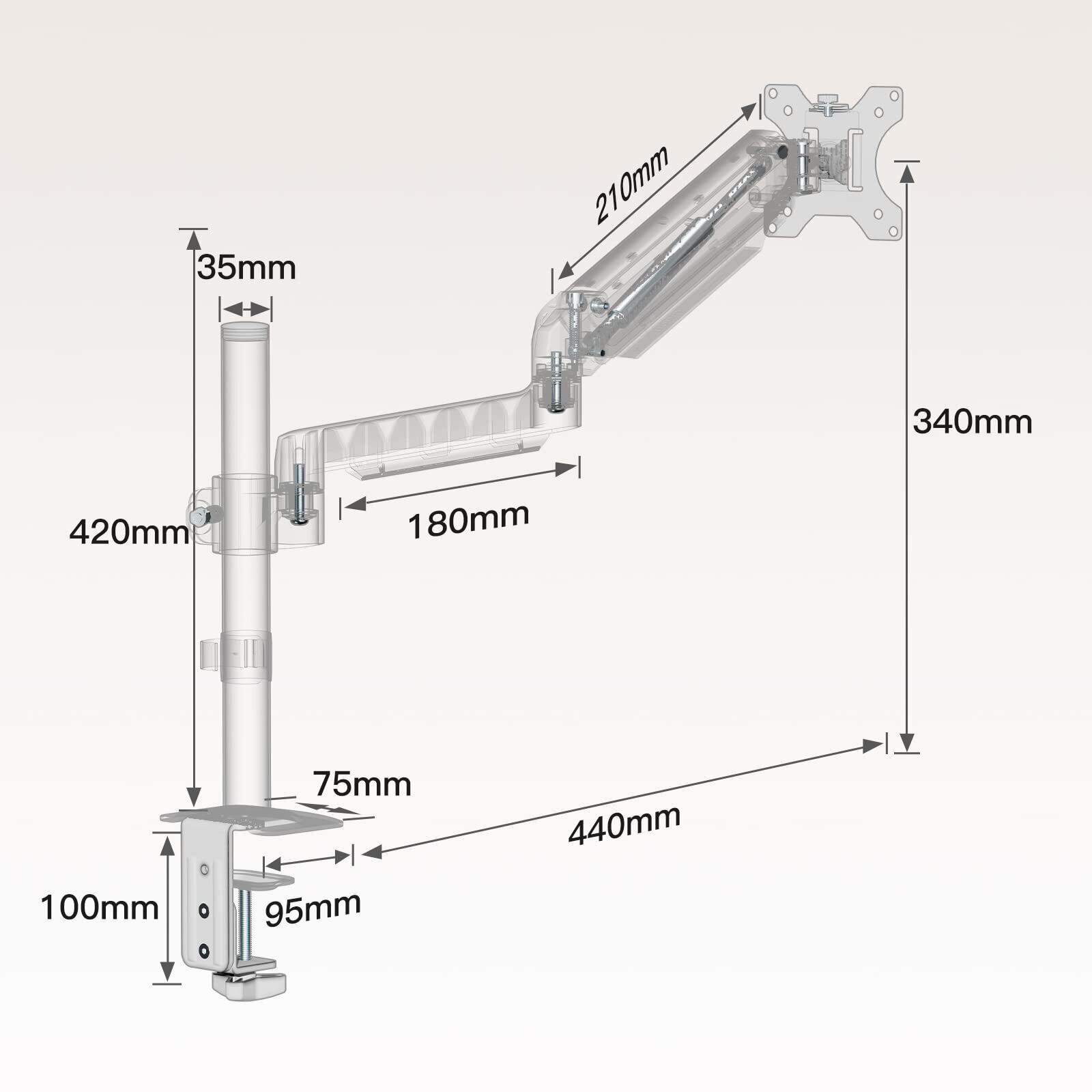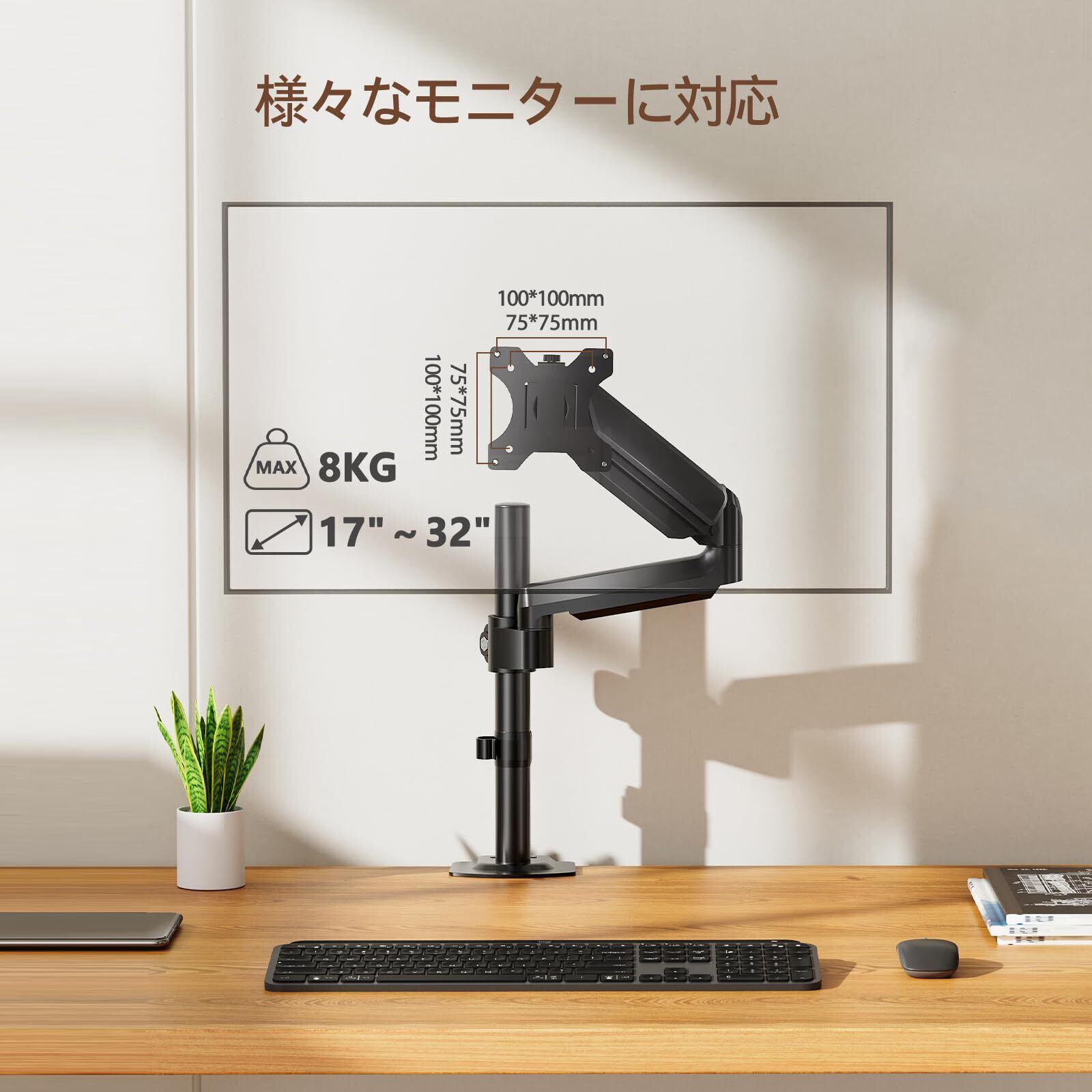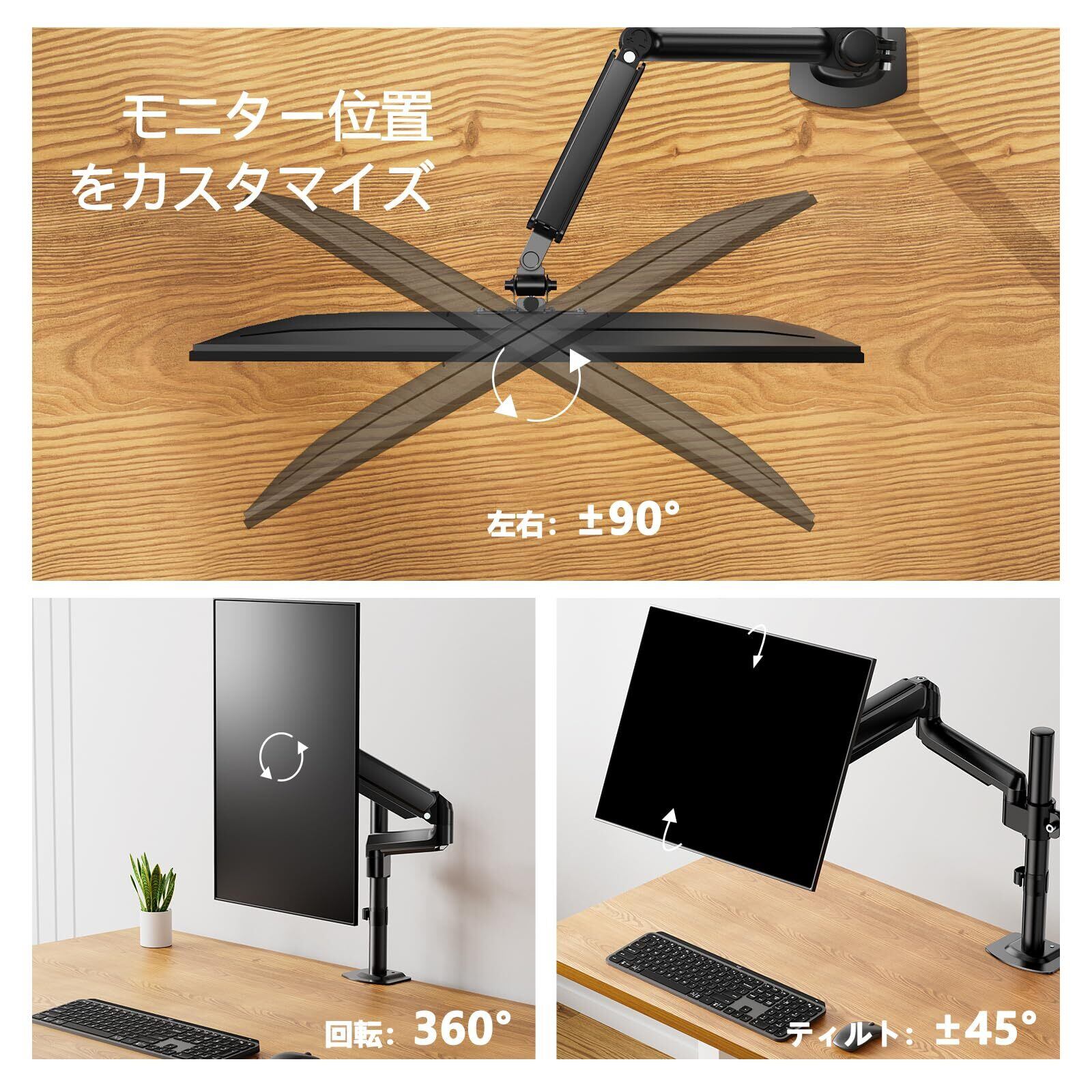 【快適にPC作業を行う】自分に合った高さや角度に変えられます。前後左右だけでなく、上下にも動かせる見やすい位置まで調節可能であるため、細かい文字や数字の確認や動画視聴などに適しています。また、モニターの位置を下げて角度を上向きにすることで、タッチパネルでの操作も便利です。※ガス圧調節方法:?モニターをアームに取り付けます?アームを水平にします?レンチでガス圧を調節します。