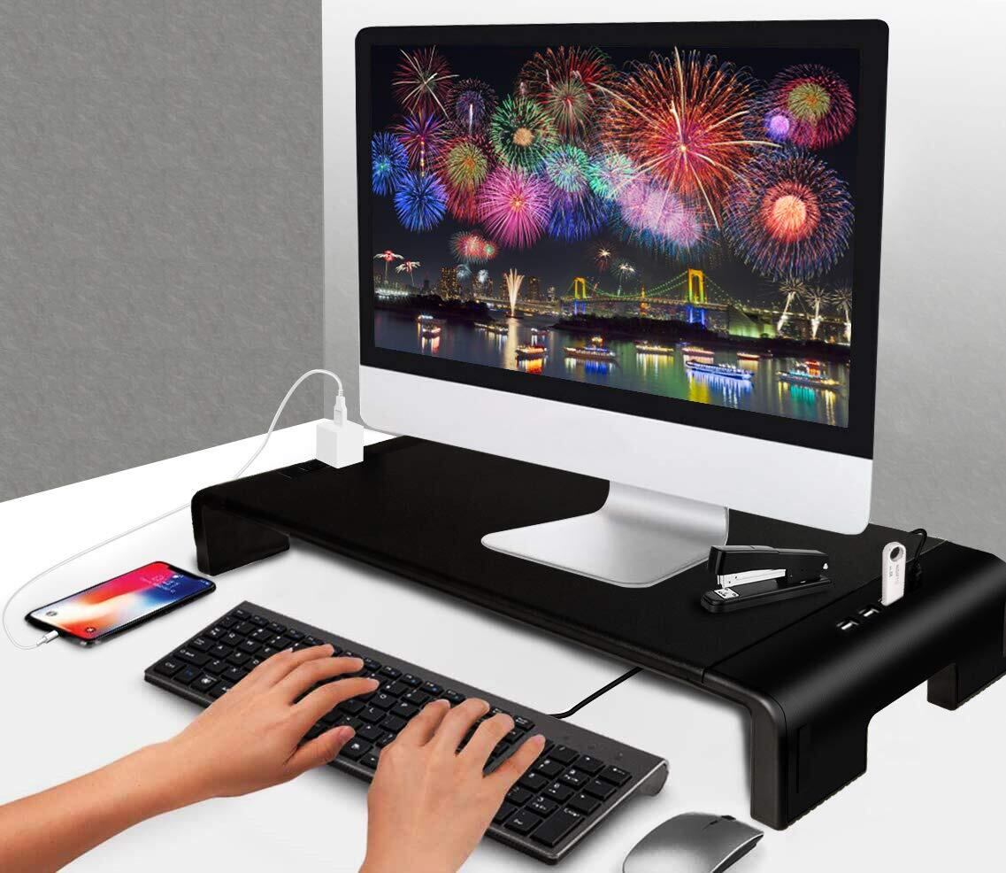 Point 2:充電や作業に便利な4*USB2.0 & 2口コンセント付,携帯電話の充電ステーションとしても使用可能,キーボードやマウスを収納してデスク上を有効活用できるモニタースタンド,データ転送がより便利になります、作業効率もアップ!